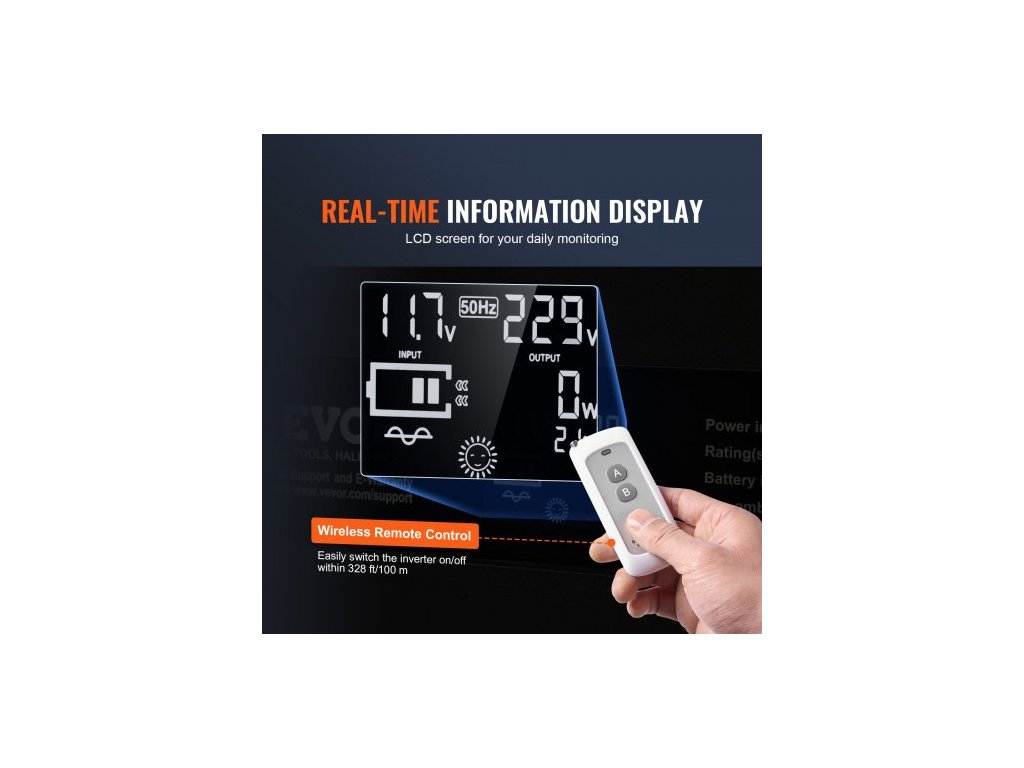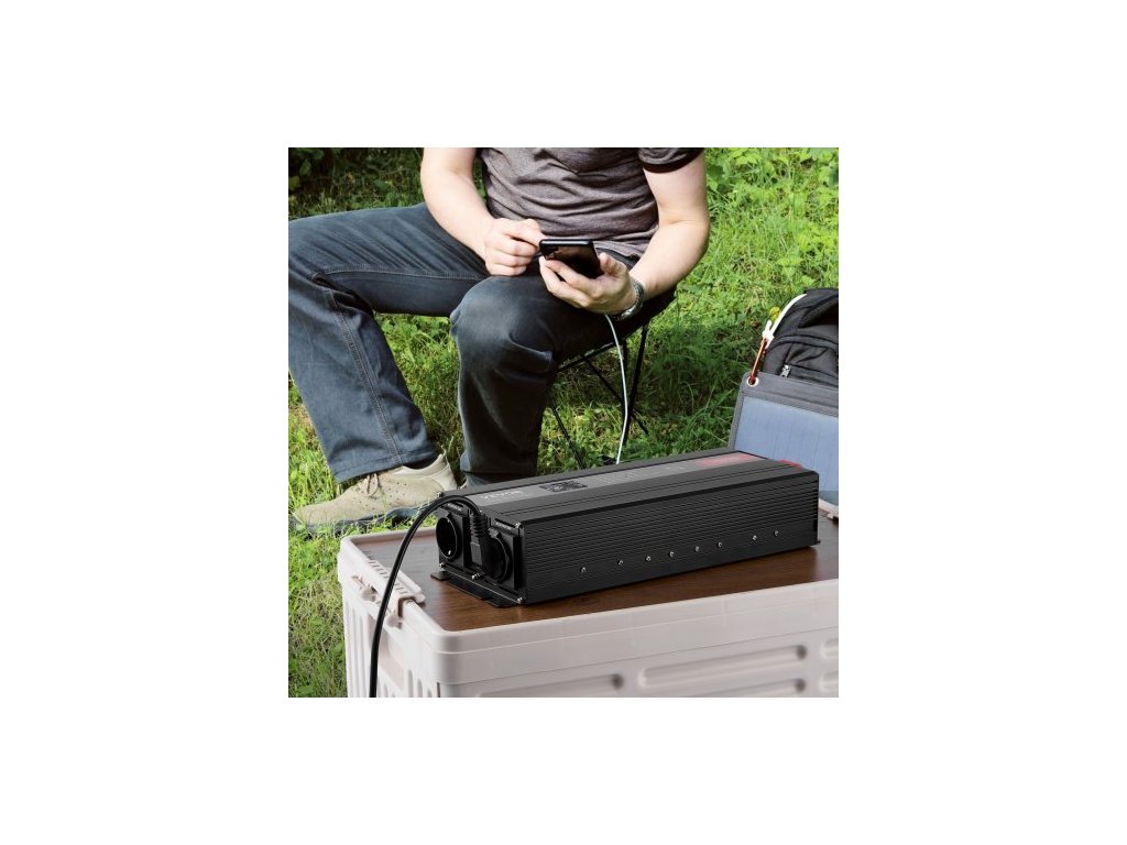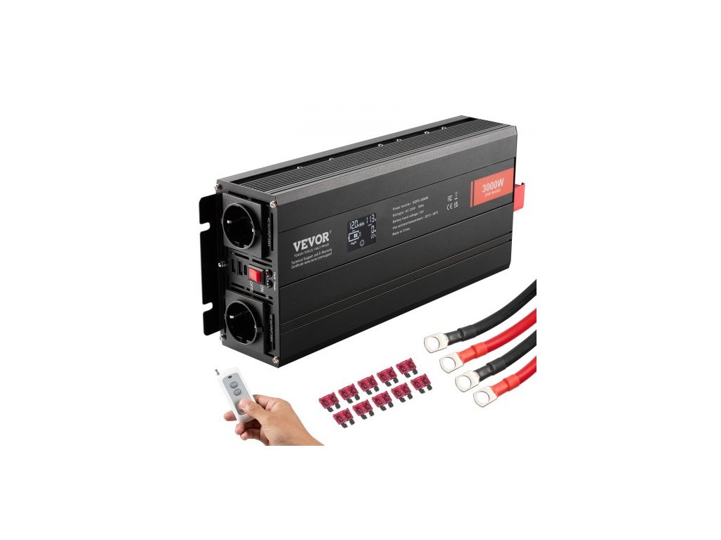 Měnič s čistou sinusovou vlnou, 3000 W, DC 12 V na AC 230 V, se 2 AC zásuvkami, 2 USB porty, 1 portem typu C, LCD displejem a dálkovým ovladačem pro velké domácí spotřebiče, certifikace CE FCC