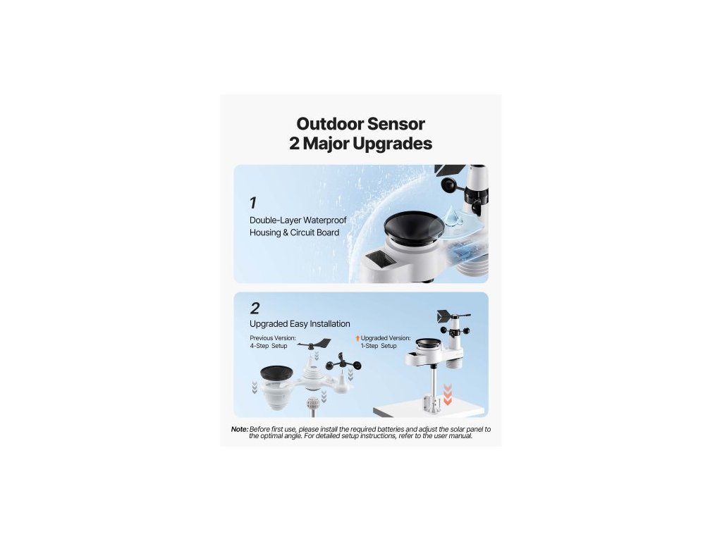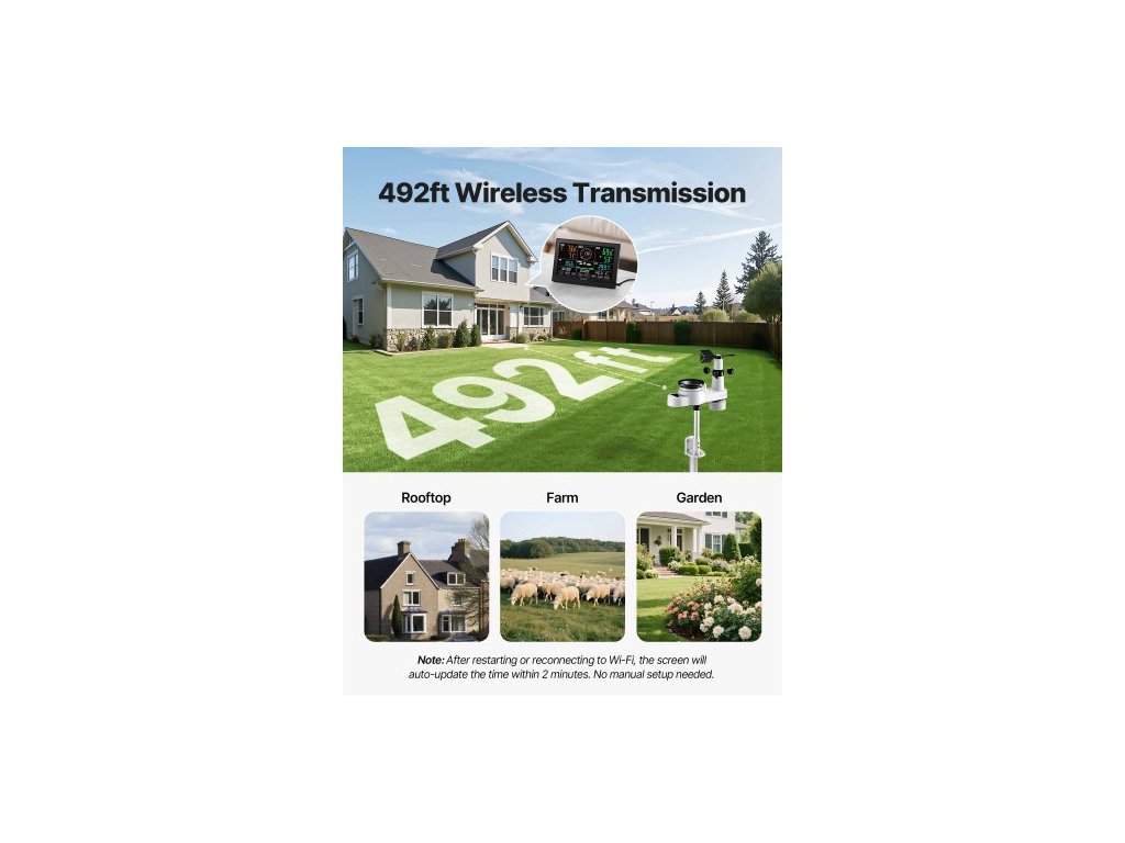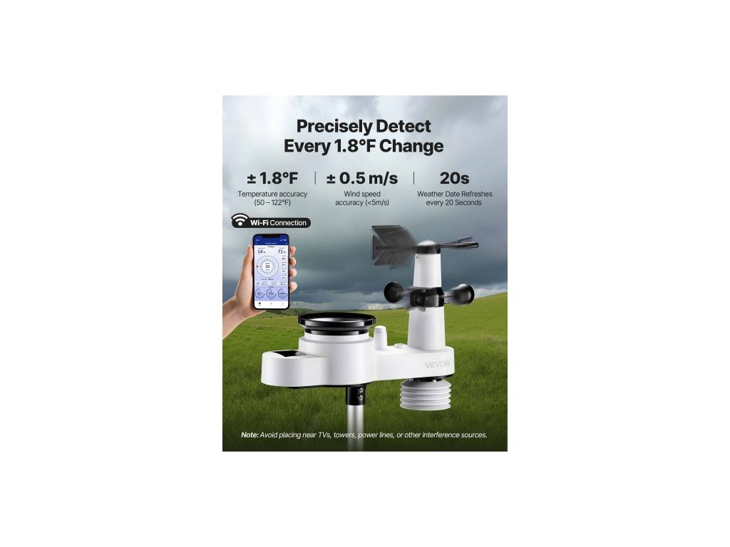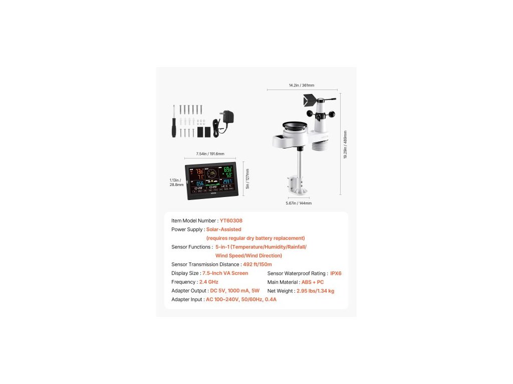 Vodotěsnost senzoru: IPX6, Velikost displeje: 7,5palcová VA obrazovka, Výstup adaptéru: DC 5 V, 1000 mA, 5 W, Funkce senzoru: 5 v 1 (teplota/vlhkost/srážky/rychlost větru/směr větru), Číslo modelu položky: YT60308, Vstup adaptéru: AC 100–240 V, 50/60 Hz, 0,4 A, Dosah senzoru: 150 m, Hlavní materiál: ABS + PC, Napájení: Solární (vyžaduje pravidelnou výměnu suché baterie), Frekvence Wi-Fi: 2,4 GHz