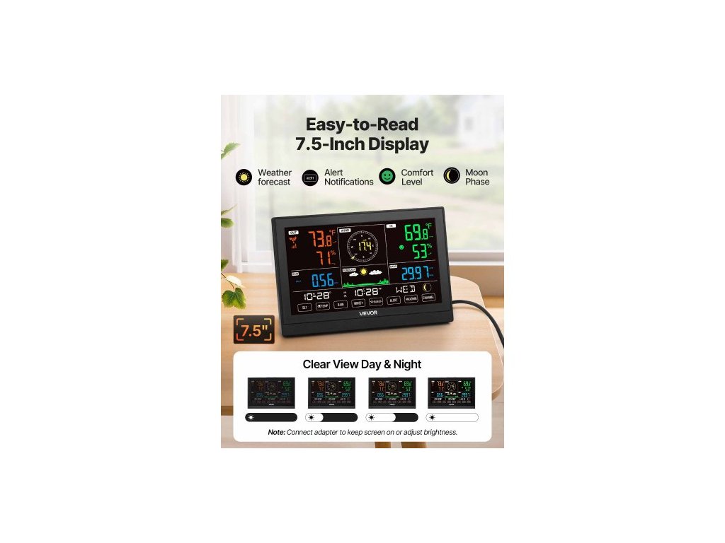 Meteorologická stanice 5 v 1 s Wi-Fi, 190,5mm VA displej, bezdrátový solární venkovní senzor, srážkoměr, pro vnitřní i venkovní použití s předpovědí počasí, rychlostí větru, směrem, teplotou, vlhkostí, srážkamiJasný displej