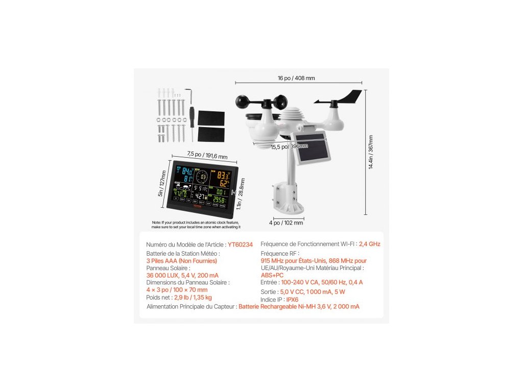 Solární panel: Osvětlení 36000 LUX, 5,4 V, 200 mA, Hlavní napájení senzoru: Dobíjecí baterie Ni-MH 3,6 V, 2000 mA, Vstup: 100–240 V AC, 50/60 Hz, 0,4 A, Rozměry displeje: 7,5 x 5 x 1,1 palce/191,6 x 127 x 28,8 mm, RF frekvence: 915 MHz pro USA 868 MHz pro EU/AU/UK, Krytí: IPX6, Baterie meteorologické stanice: 3 x baterie AAA (nejsou součástí balení), Výstup: 5,0 V DC, 1000 mA, 5 W, Číslo modelu položky: YT60234, Velikost solárního panelu: 100 x 70 mm, Provozní frekvence Wi-Fi: 2,4 GHz, Čistá hmotnost: 1,35 kg, Rozměry senzoru: 408 x 396 x 367 mm, Hlavní materiál: ABS+PC