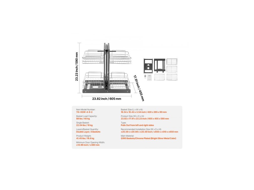 Minimální šířka otvoru dveří: 14,96 palce / ≥380 mm,Číslo modelu položky: YG-XGW-4-9-2,Hmotnost výrobku: 41,45 lbs / 18,8 kg,Rozměry koše: 16,54 x 10,43 x 3,54 palce / 420 x 265 x 90 mm,Jeden koš: 22,04 lbs / 10 kg,Doporučená velikost instalace: ≥25,59 x ≥20,08 x ≥25,59 palce / ≥650 x ≥510 x ≥650 mm,Nosnost koše: 40 kg,Hlavní materiál: Koše Q195/chromované,Rozměry výrobku: 605 x 455 x 590 mm
