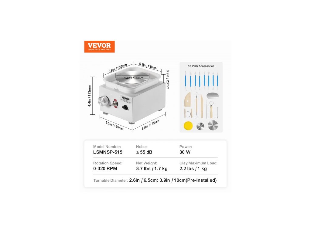 Maximální výkon: 30 W,Hlučnost: ≤55 dB,Barva: Bílá,Číslo modelu položky: LSMNSP-515,Maximální nosnost keramiky: 2,2 lbs / 1 kg,Velikost předinstalovaného kruhu: Φ3,94" / Φ10 cm,Rozsah otáček: 0-320 ot./min.