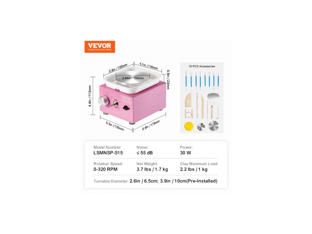 Maximální výkon: 30 W,Hlučnost: ≤55 dB,Barva: Růžová,Číslo modelu položky: LSMNSP-515,Maximální nosnost keramiky: 2,2 lbs / 1 kg,Velikost předinstalovaného kruhu: Φ3,94" / Φ10 cm,Rozsah otáček: 0-320 ot./min.