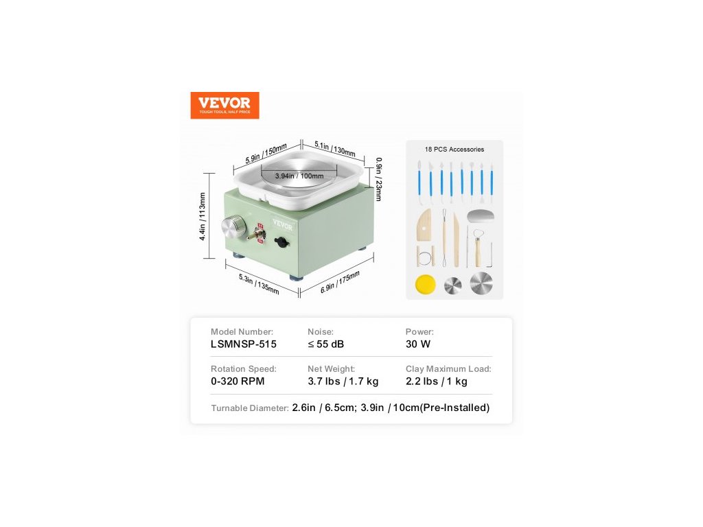 Maximální výkon: 30 W,Hlučnost: ≤55 dB,Barva: Zelená,Číslo modelu položky: LSMNSP-515,Maximální nosnost keramiky: 2,2 lbs / 1 kg,Velikost předinstalovaného kruhu: Φ3,94" / Φ10 cm,Rozsah otáček: 0-320 ot./min.