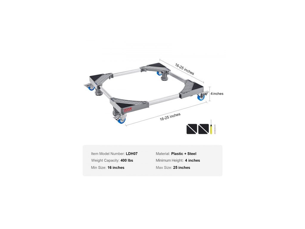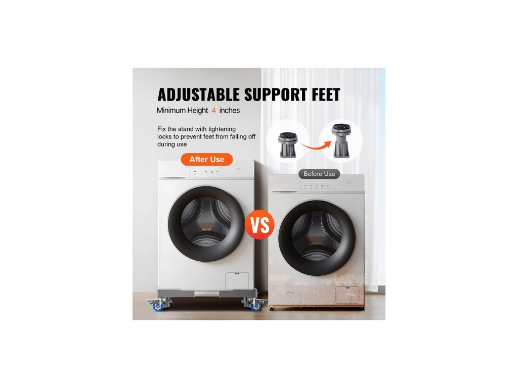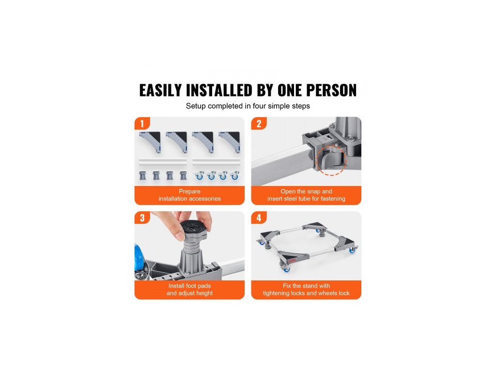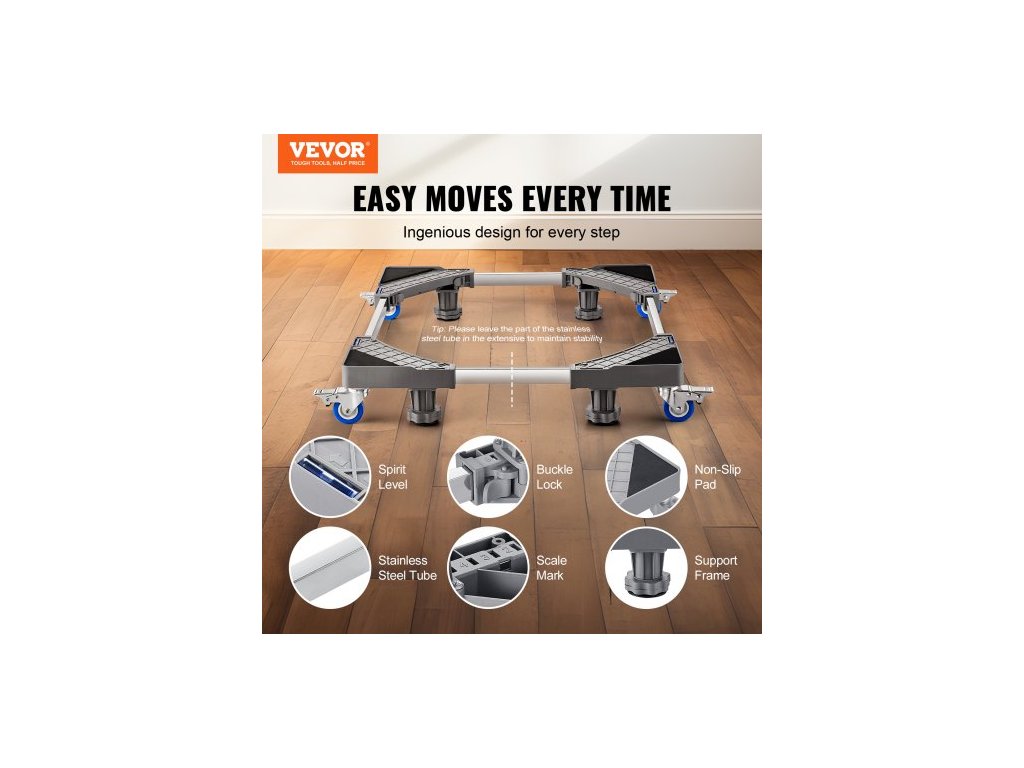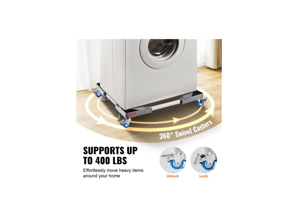 Stojan na mini ledničku , nosnost 181,4 kg, 4 pevné nožičky, 4 otočná kolečka s aretací, podstavec pro pračku a sušičku, multifunkční nastavitelná základna pro pračku a ledničku, univerzální mobilní základnaPevná opora