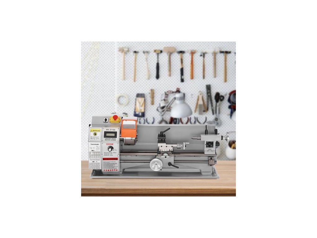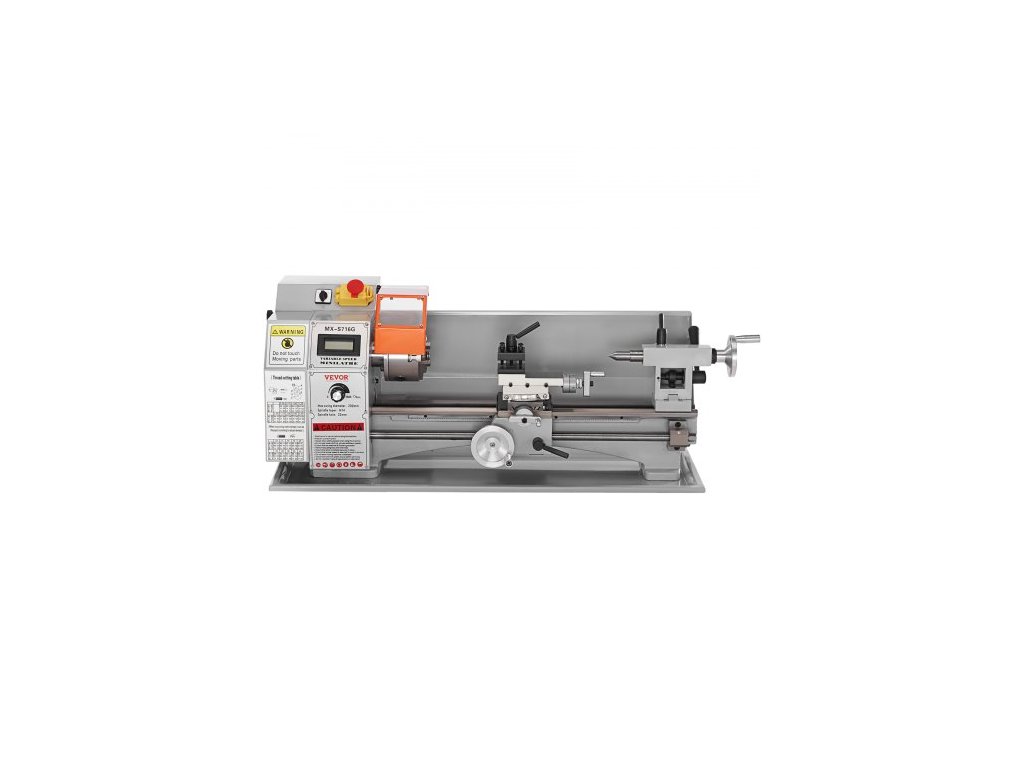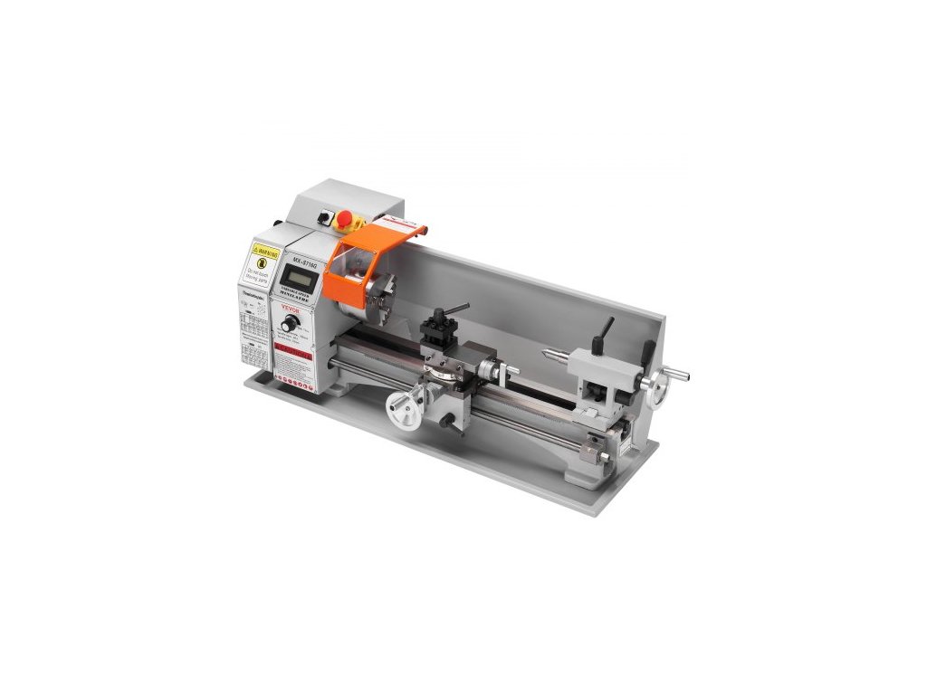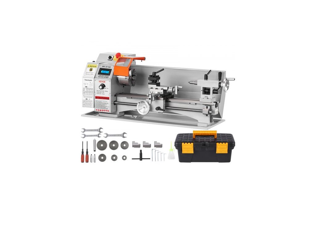 Mini soustruh na kov , 17,8 cm x 40,7 cm, přesný stolní soustruh na kov s výkonem 800 W, plynule nastavitelná rychlost 150–2500 ot./min, s 9,9cm tříčelisťovým kovovým sklíčidlem, box s nářadím pro zpracování přesných dílůOchranná zařízení