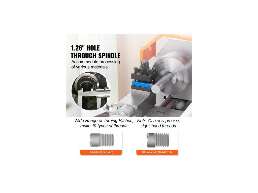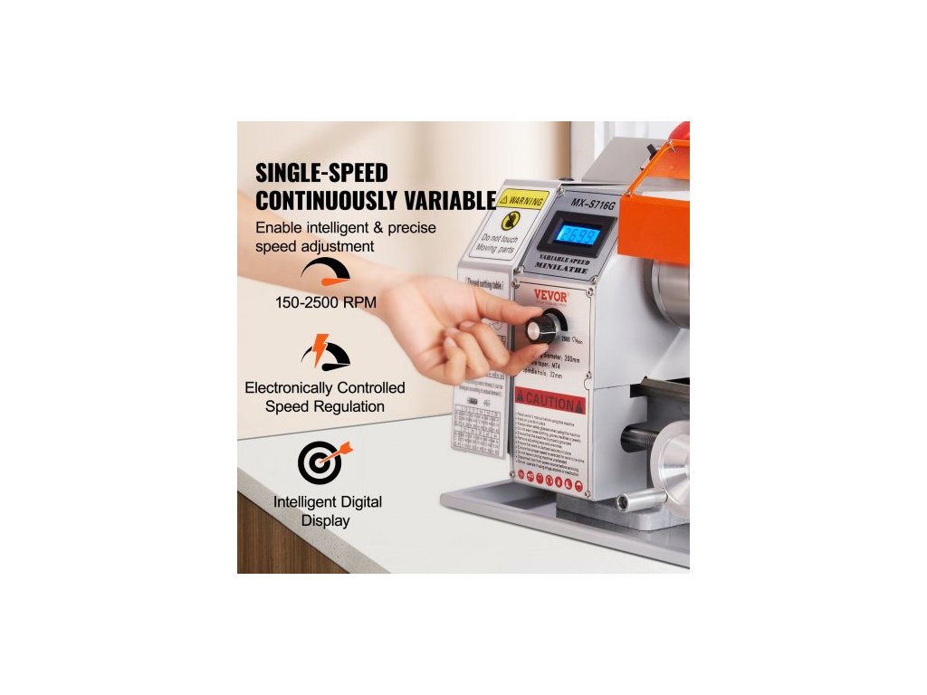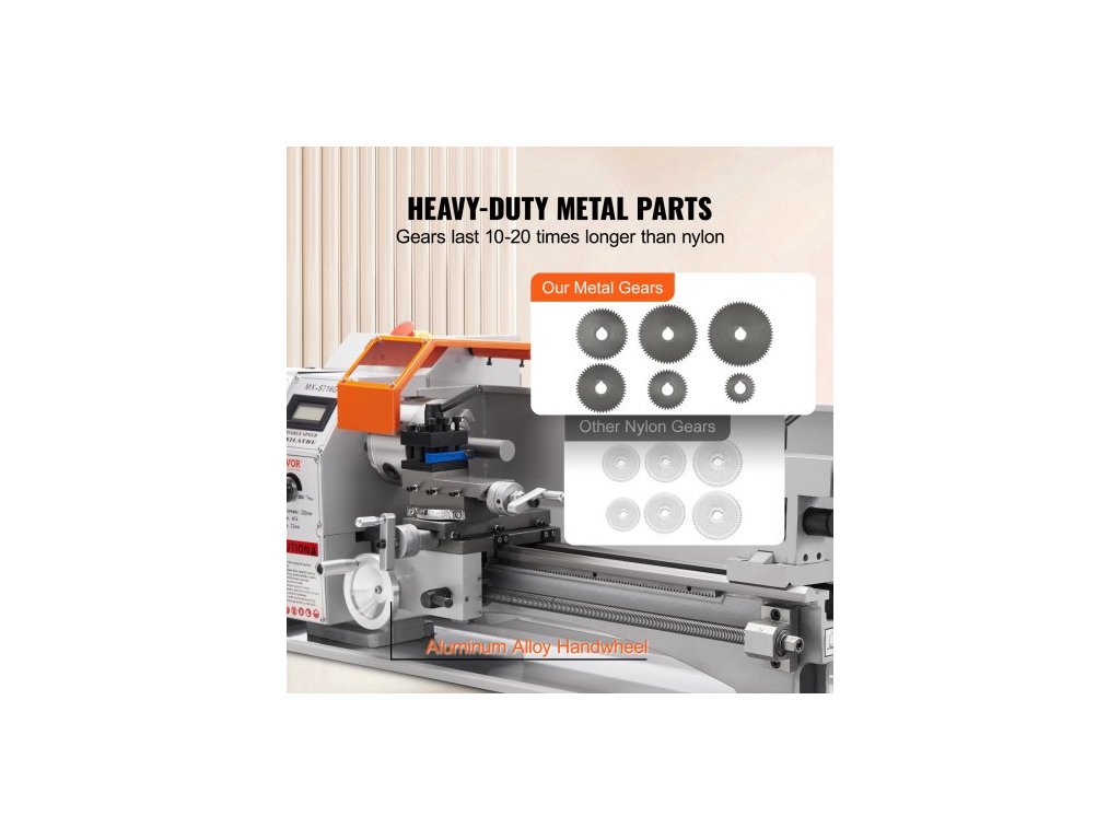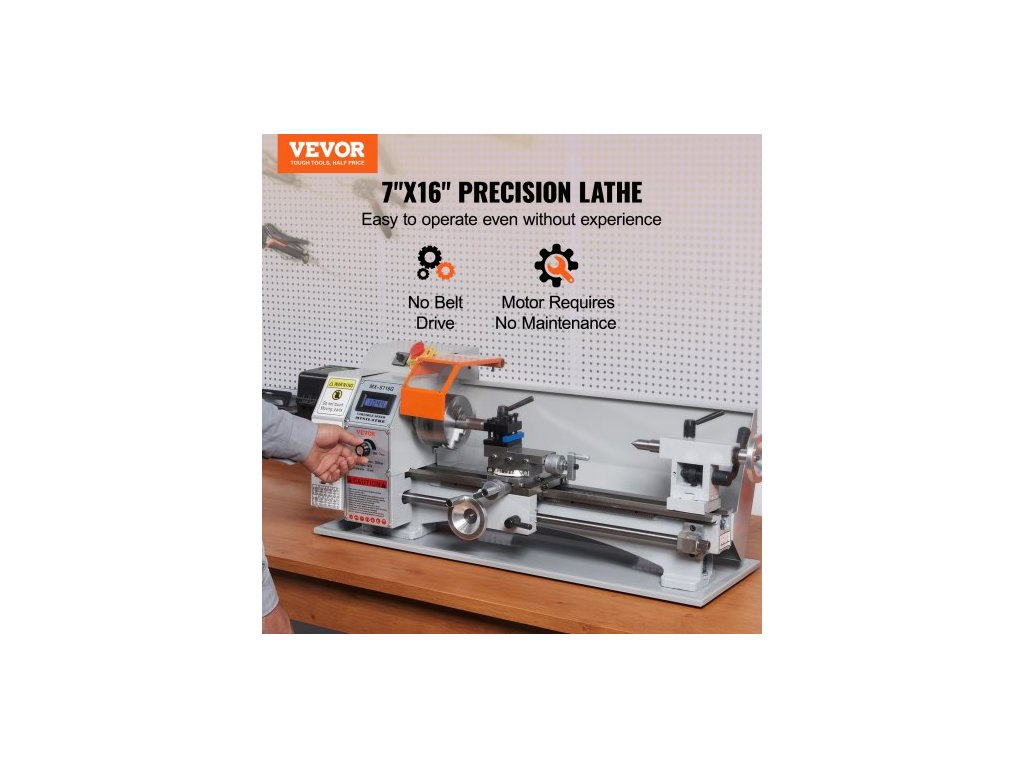 Mini soustruh na kov , 17,8 cm x 40,7 cm, přesný stolní soustruh na kov s výkonem 800 W, plynule nastavitelná rychlost 150–2500 ot./min, s 9,9cm tříčelisťovým kovovým sklíčidlem, box s nářadím pro zpracování přesných dílůOchranná zařízení