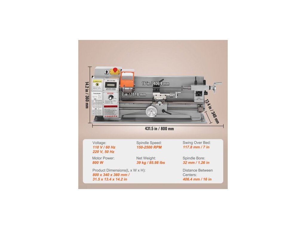Otáčky vřetena: 150–2500 ot./min, Kužel koníku: MK2, Průměr vřetena skrz otvor: 32 mm / 1,26 palce, Napětí: 110 V, 60 Hz, Model: MX-S716G, Výkon motoru: 800 W, Průměr sklíčidla: 100 mm / 3,93 palce, Kužel vřetena: MK5, Rozměry výrobku (D x Š x V): 800 x 340 x 360 mm / 31,5 x 13,4 x 14,2 palce, Životnost: 3 roky, Čistá hmotnost: 39 kg / 85,98 lbs, Hlavní materiál: Litina HT200