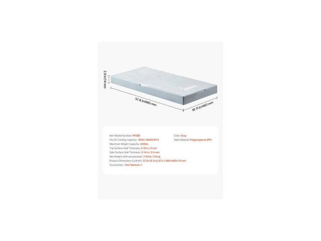 Čistá hmotnost (s příslušenstvím): 7,94 lb / 3,6 kg,Rozměry položky (DxŠxV): 37,8 x 18,11 x 2,91 palce / 960 x 460 x 74 mm,Barva: Šedá,Číslo modelu položky: PP096,Vhodné pro klimatizační systémy s chladicím výkonem: 9000-36000 BTU,Maximální nosnost: 400 lbs / 181 kg, Hlavní materiál: Polypropylen (PP)