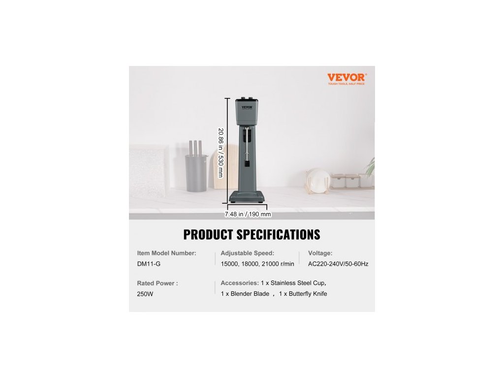 Nastavitelná rychlost: 15000, 18000, 21000 ot./min, Maximální nastavení časovače: 10 min, Kapacita: 820 ml, Napětí: AC220V-240V/50-60Hz, Číslo modelu: DM11-U, Jmenovitý výkon: 250 W, Materiál: SUS304, Provozní hluk: ≤75 dB, Čistá hmotnost: 5,4 kg, Rozměry výrobku: 190 x 190 x 530 mm