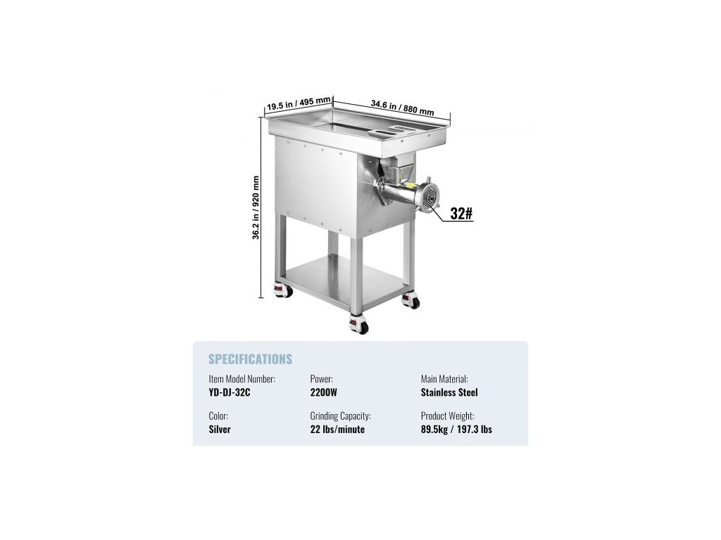 Barva: Stříbrná,Číslo modelu položky: YD-DJ-32C,Hmotnost výrobku: 197,3 lbs / 89,5 kg,Mlecí kapacita: 22 lbs/min,Velikost ústí: 32#,Příkon: 2200W,Hlavní materiál: Nerezová ocel,Rozměry výrobku: 34,6 x 19,5 x 36,2 palce / 880 x 495 x 920 mm