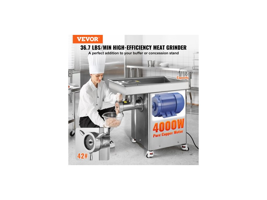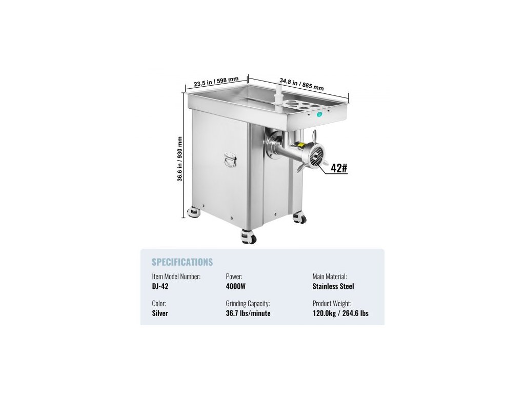Barva: Stříbrná,Číslo modelu položky: DJ-42,Hmotnost výrobku: 264,6 lbs / 120,0 kg,Mlecí kapacita: 36,7 lbs/min,Velikost ústí: 42#,Výkon: 4000W,Hlavní materiál: Nerezová ocel,Rozměry výrobku: 36,6 x 23,5 x 34,8 palce / 930 x 598 x 885 mm