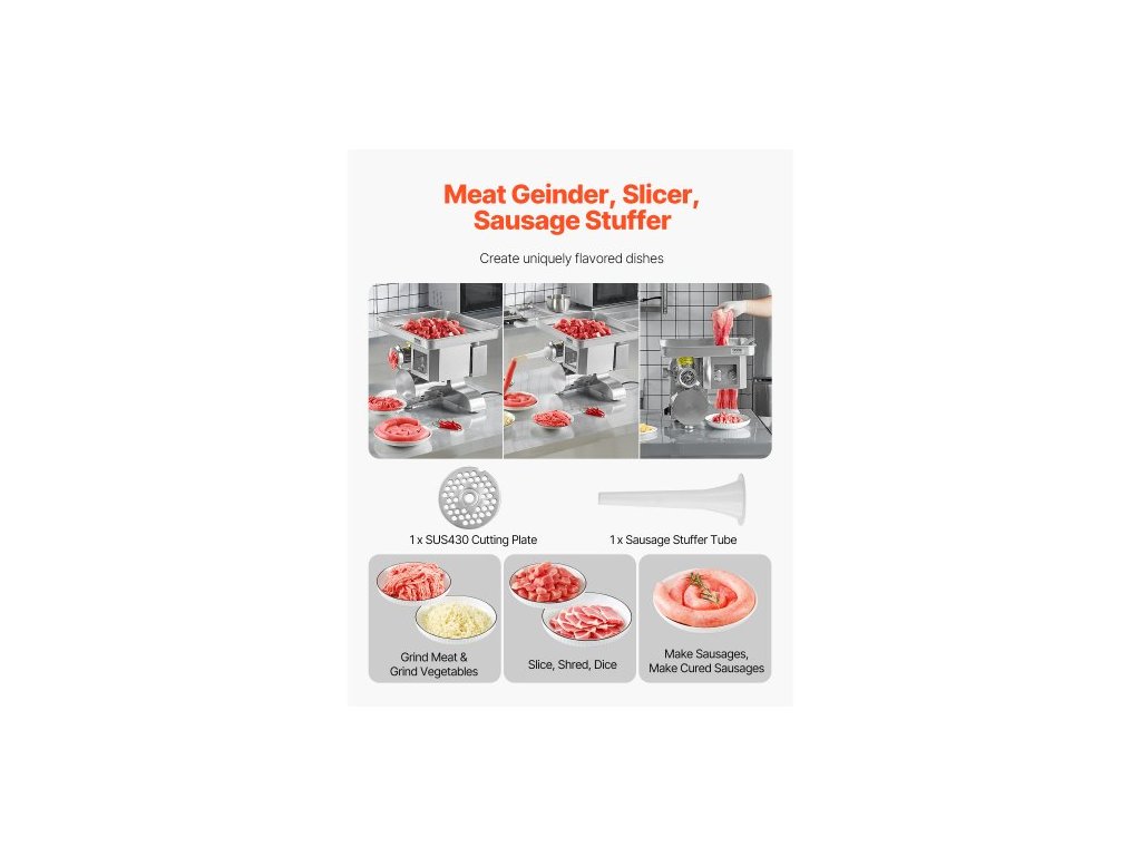 Mlýnek na maso , elektrický mlýnek na maso s výkonem 11 lbs/min, kráječ, plnička klobás s čepelí, mlecí deska, výrobník klobás, nerezový profesionální mlýnek na maso na krájení, drcení a kostky, řeznictví v restauraciMultifunkční