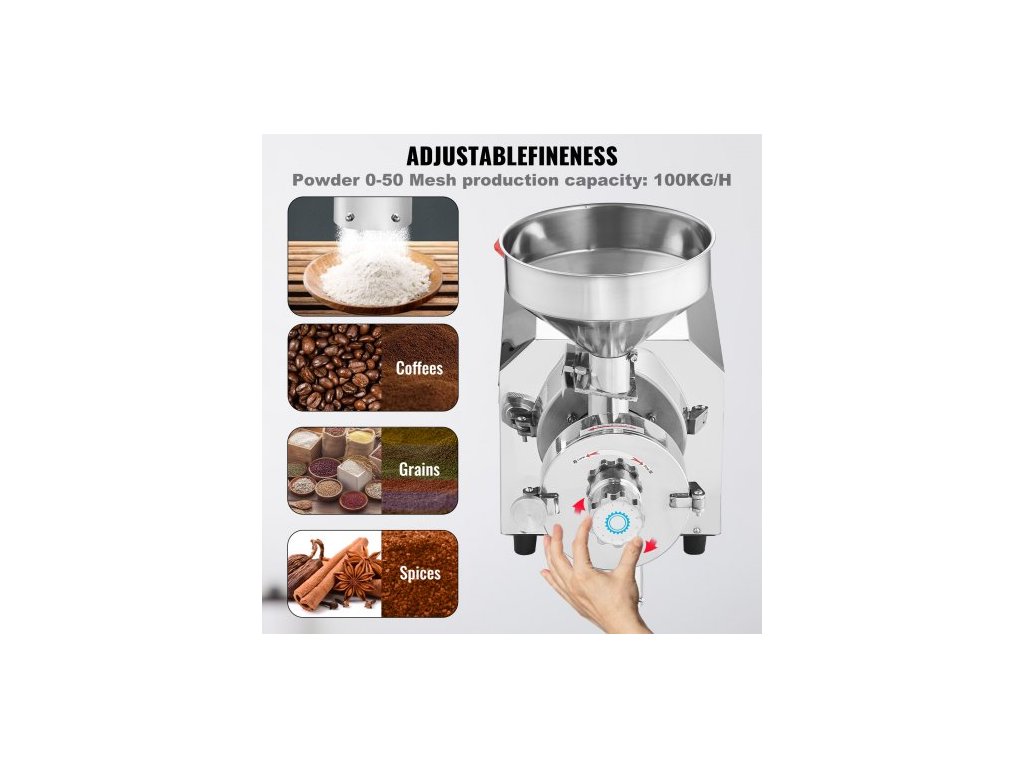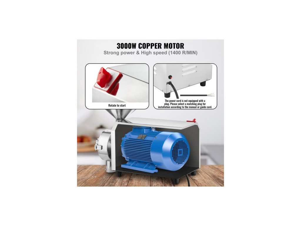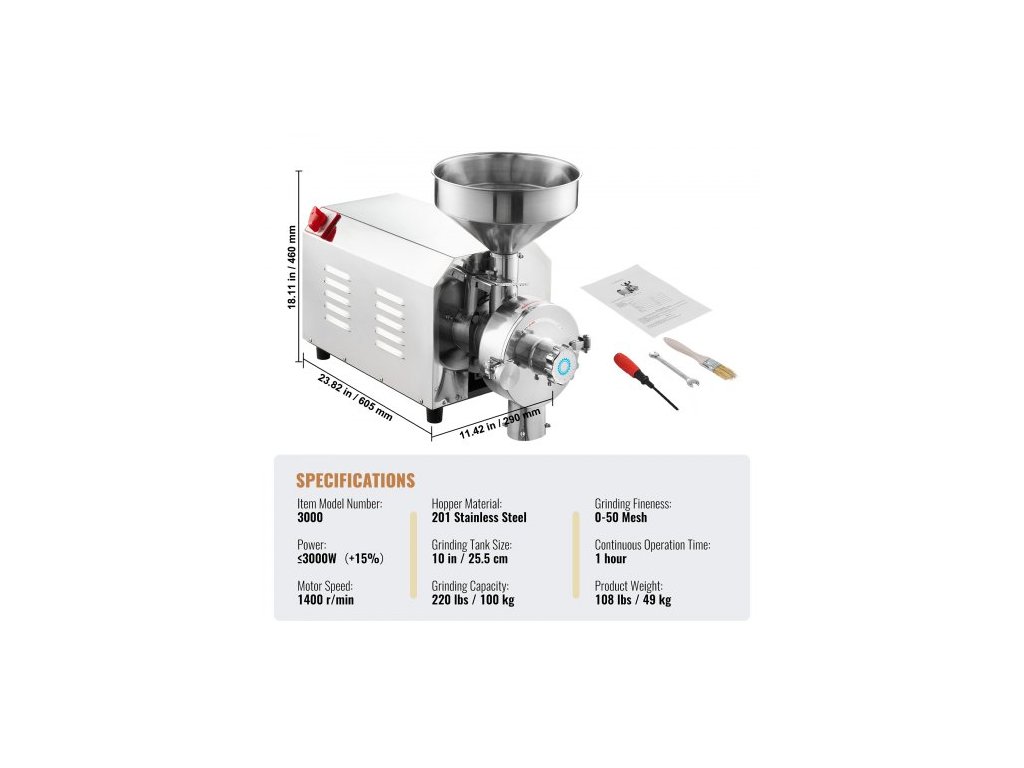 Otáčky motoru: 1400 ot/min,Rozměry výrobku (D x Š x V): 23,82 x 11,42 x 18,11 palce / 605 x 290 x 460 mm,Materiál násypky: Nerezová ocel 201,Průměr násypky: 10" / 25,5 cm,Rychlost mletí: 220 lbs / 100 kg za hodinu,Číslo modelu položky: 3000,Nepřetržitý provoz Doba: 1 hodina, Jemnost mletí: 0-50 mesh, Čistá hmotnost: 49 kg, Výkon: 3000 W