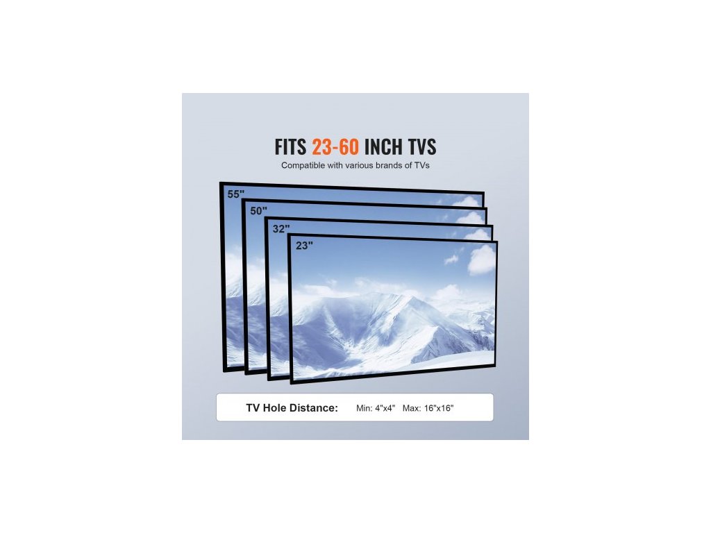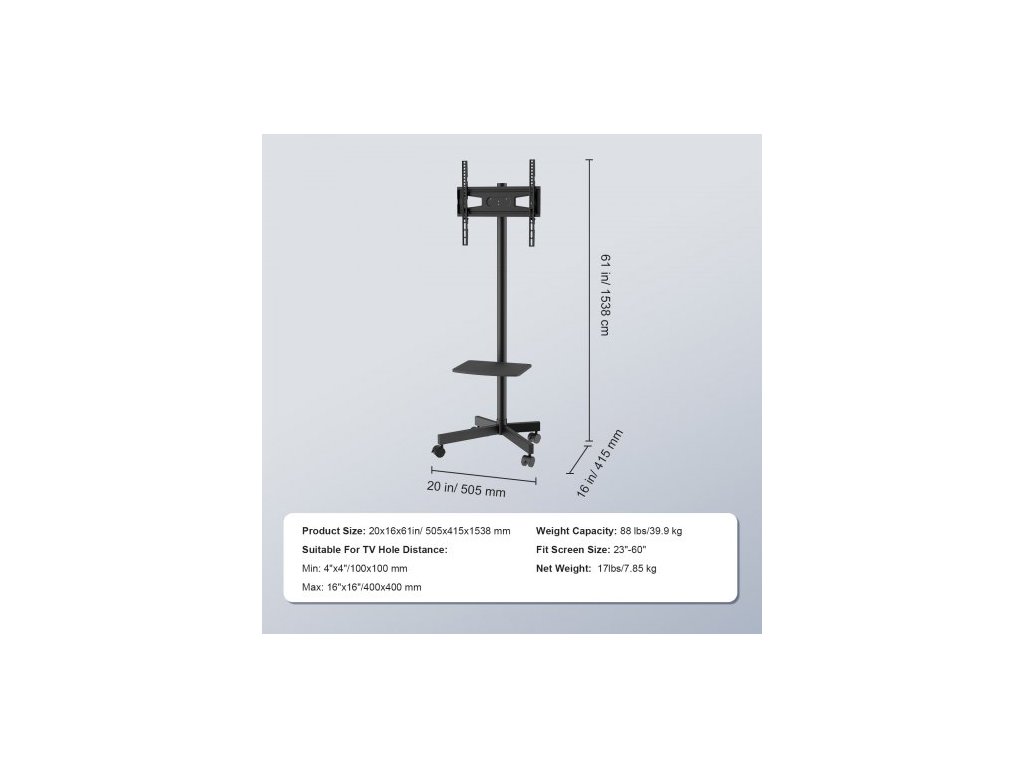Nastavitelná výška: 56-61 palců/1430-1538 mm, Nosnost: 88 lbs/39,9 kg, Vhodné pro vzdálenost otvorů pro TV: Min: 4"x4"/100x100 mm, Max: 16"x16"/400x400 mm, Vhodný pro velikost obrazovky: 16"-60", Čistá hmotnost: 17 lbs/7,85 kg, Velikost produktu: 20x16x61 palců / 505x415x1538 mm