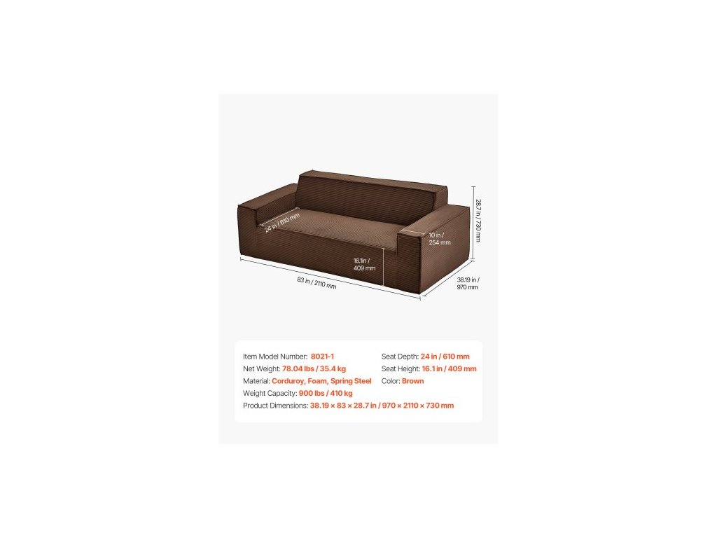 Nosnost jednoho sedáku: 900 lbs / 410 kg,Hloubka sedáku: 24 in / 610 mm,Barva: Hnědá,Číslo modelu položky: Jan-21,Výška sedáku: 16,1 in / 409 mm,Materiál: Manšestr, Pěna, Pružinová ocel,Rozměry výrobku: 38,19 x 83 x 28,7 in / 970 x 2110 x 730 mm,Čistá hmotnost: 78,04 lbs / 35,4 kg