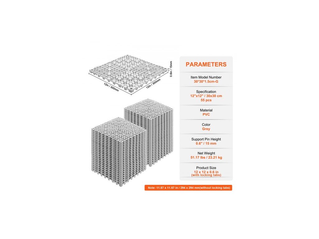 Výška podpěrného čepu: 0,6''/15 mm,Barva: šedá,Číslo modelu položky: 30*30*1,5 cm-G,Specifikace: 12"x 12"/30 x 30 cm (s pojistnými jazýčky), 55 ks,Materiál: PVC,Čistá hmotnost: 51,17 lbs/23,21 kg,Rozměry výrobku: 12 x 12 x 0,6 palce/300 x 300 x 15 mm (s pojistnými jazýčky)