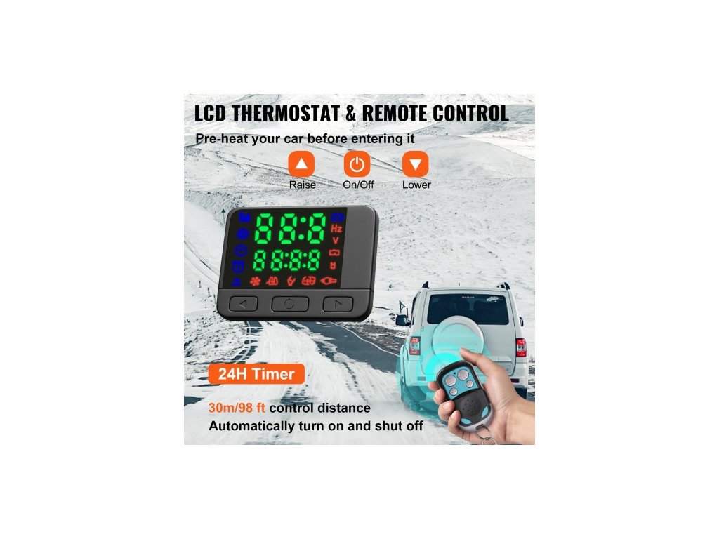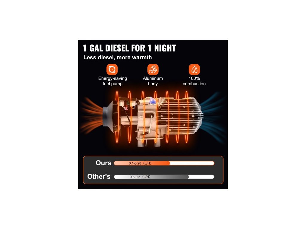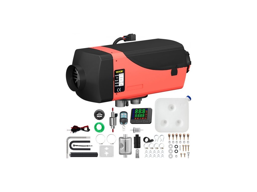 Rozměry nádrže (D x V x H): 21,65 x 15,75 x 0,31 palce/55 x 40 x 0,8 cm, nastavitelná teplota. Rozsah: 46℉-95℉/8℃-35℃, Spotřeba paliva (l/h): 0,1-0,28 (l/h)/ 0,026 - 0,074 (gal/h), Typ klimatizace: Topení, Typ paliva: Nafta, Jmenovité napětí: 12V, Objem nádrže: 10 l/2,6 gal, Účinnost spalování: 100 %, Rozměry topení (D x Š x V): 13,78" x 4,7" x 5,9"/350 x 120 x 150 mm, Rozměry výfukového potrubí (D x Š): 59 x 2,5 cm/23,2 x 0,98 palce, Spínač: LCD, Dosah dálkového ovládání: 98 stop/30 m, Provozní teplota: -104℉~+68℉/-40 °C~+20 °C,Výkon ohřívače: 2 kW,Rozměry vstupního potrubí (D x Š): 50 x 2,5 cm / 19,7 x 0,98 palce,Rozměry výstupního potrubí (D x Š): 70 x 7,6 cm / 27,6 x 2,99 palce