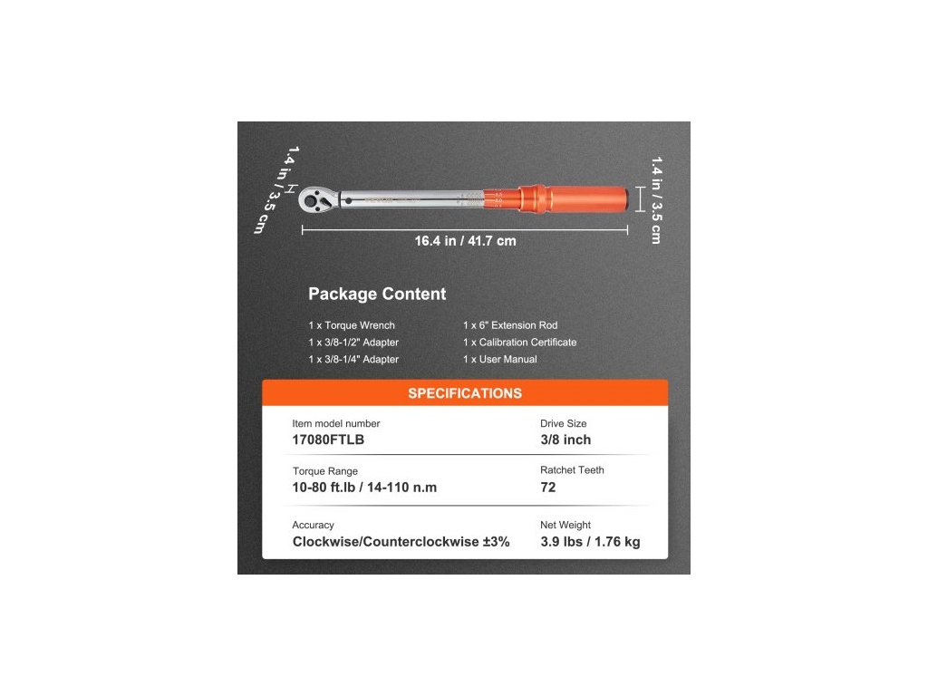 Počet zubů ráčny: 72,Přesnost: Ve směru/proti směru hodinových ručiček ±3 %,Číslo modelu položky: 17080FTLB,Čistá hmotnost: 3,9 lbs / 1,76 kg,Velikost pohonu: 3/8 palce,Rozsah točivého momentu: 10-80 ft.lb / 14-110 nm,Rozměry výrobku: 16,4 × 1,4 × 1,4 palce / 41,7 × 3,5 × 3,5 cm,Rozměry balení: 21,9 × 4,9 × 3 palce / 55,5 × 12,5 × 7,5 cm