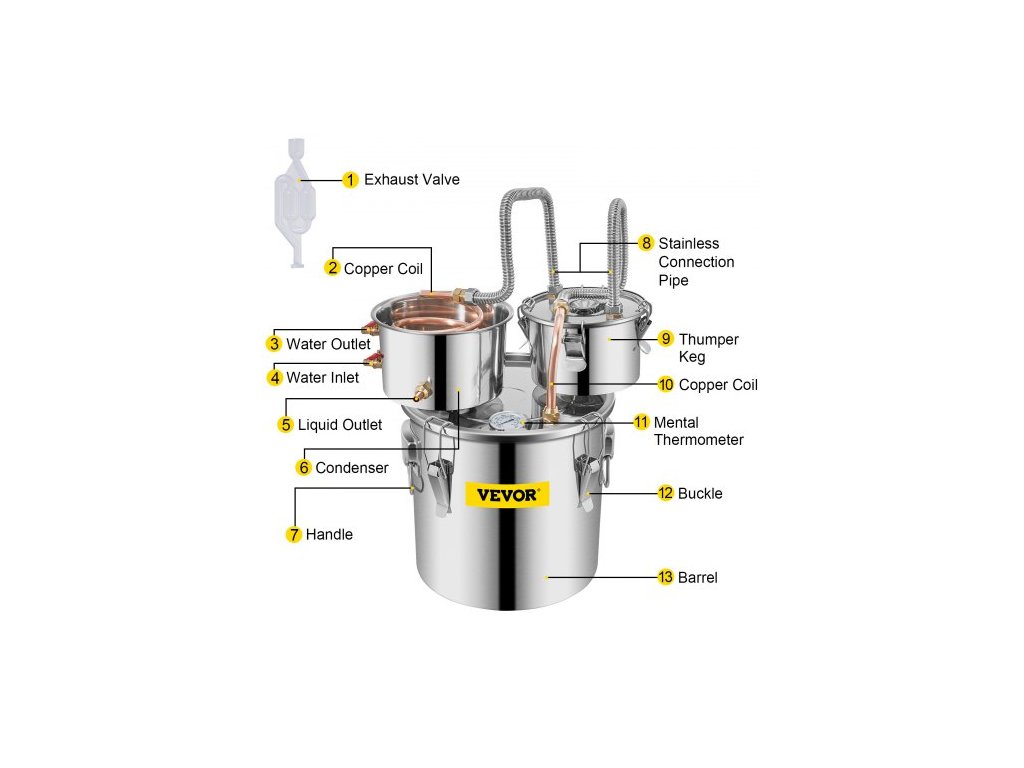 Objem kotlového sudu: 3 Gal / 11,4 L, Průměr měděné spirály: 0,39" / 10 mm, Velikost kotlového sudu: 9,8" x 9,8" / 25x25 cm, Velikost sudu Thumper: 7" x 4" / 18x10 cm, Velikost kondenzačního sudu: 7,9"x4,3" / 20x11 cm, Tloušťka sudu: 0,03" / 0,7 mm, Hmotnost výrobku: 9,8 lbs / 4,43 kg, Materiál: Nerezová ocel + červená měď, Objem kondenzačního sudu: 0,92 galonu / 3,5 l