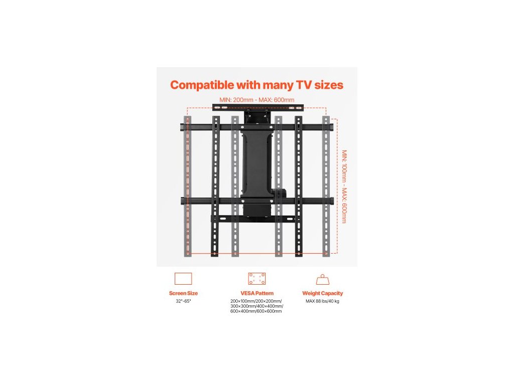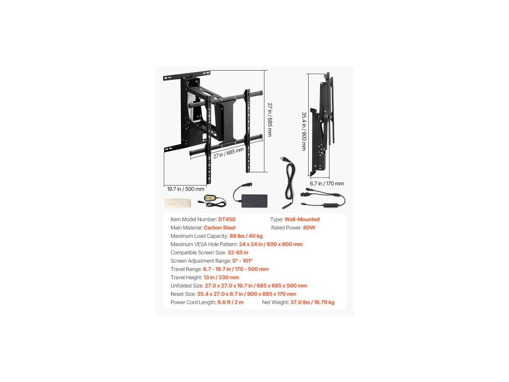Kompatibilní velikost obrazovky: 32 - 65 palců,Resetovací velikost: 900 x 685 x 170 mm,Rozsah nastavení obrazovky: 0° - 101°,Rozměry v rozloženém stavu: 27,0 x 27,0 x 19,7 palce / 685 x 685 x 500 mm, Max. kompatibilita s držákem VESA: 24 x 24 palce / 600 x 600 mm, Délka napájecího kabelu: 6,6 stop / 2 m, Typ: Nástěnný, Výška pojezdu: 13 palců / 330 mm, Rozsah pojezdu: 6,7 - 19,7 palce / 170 - 500 mm, Číslo modelu položky: DT450, Maximální nosnost: 88 liber / 40 kg, Jmenovitý výkon: 80 W, Čistá hmotnost: 37,0 liber / 16,79 kg, Hlavní materiál: Uhlíková ocel