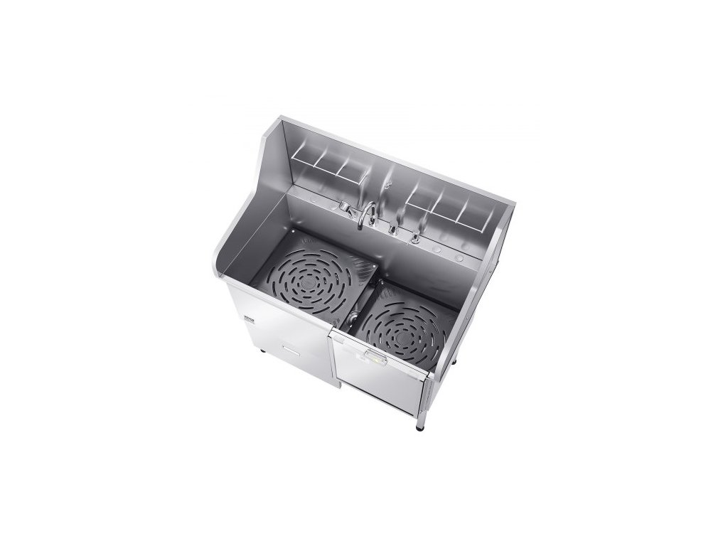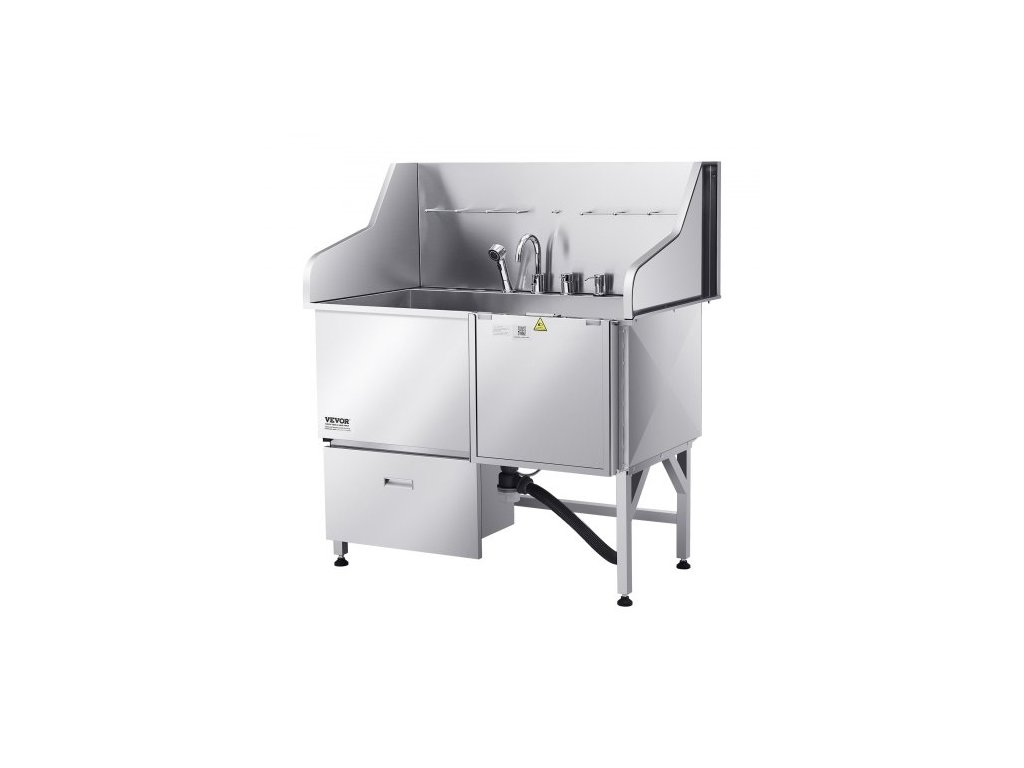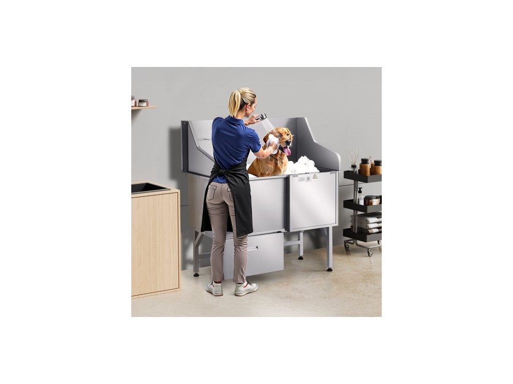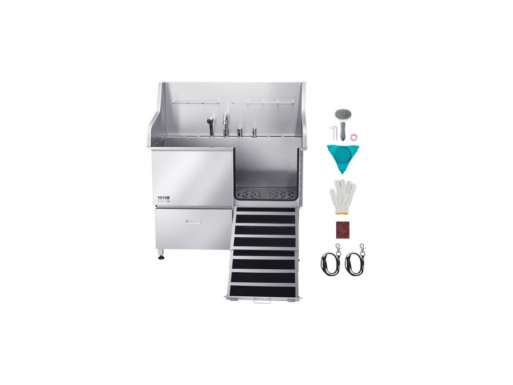 Mycí stanice pro psy 304 z nerezové oceli, vana na stříhání domácích mazlíčků o průměru 127 cm s protiskluzovou rampou s nízkým sklonem, úložným prostorem, kohoutkem na teplou a studenou vodu, univerzální vana pro stříhání, vhodná pro všechny