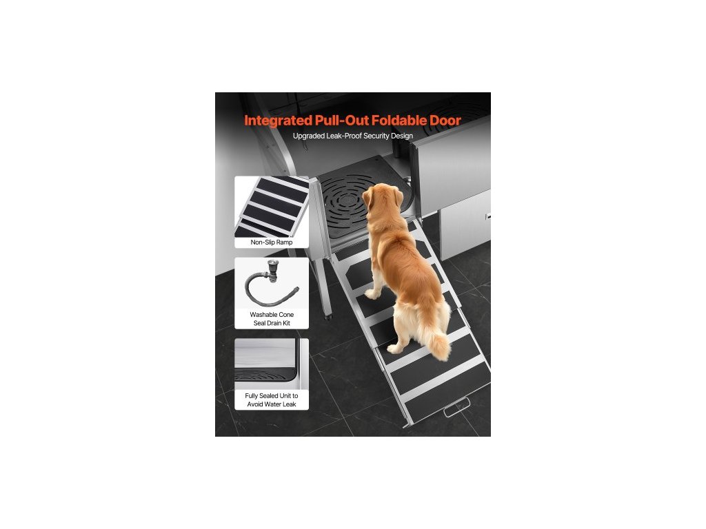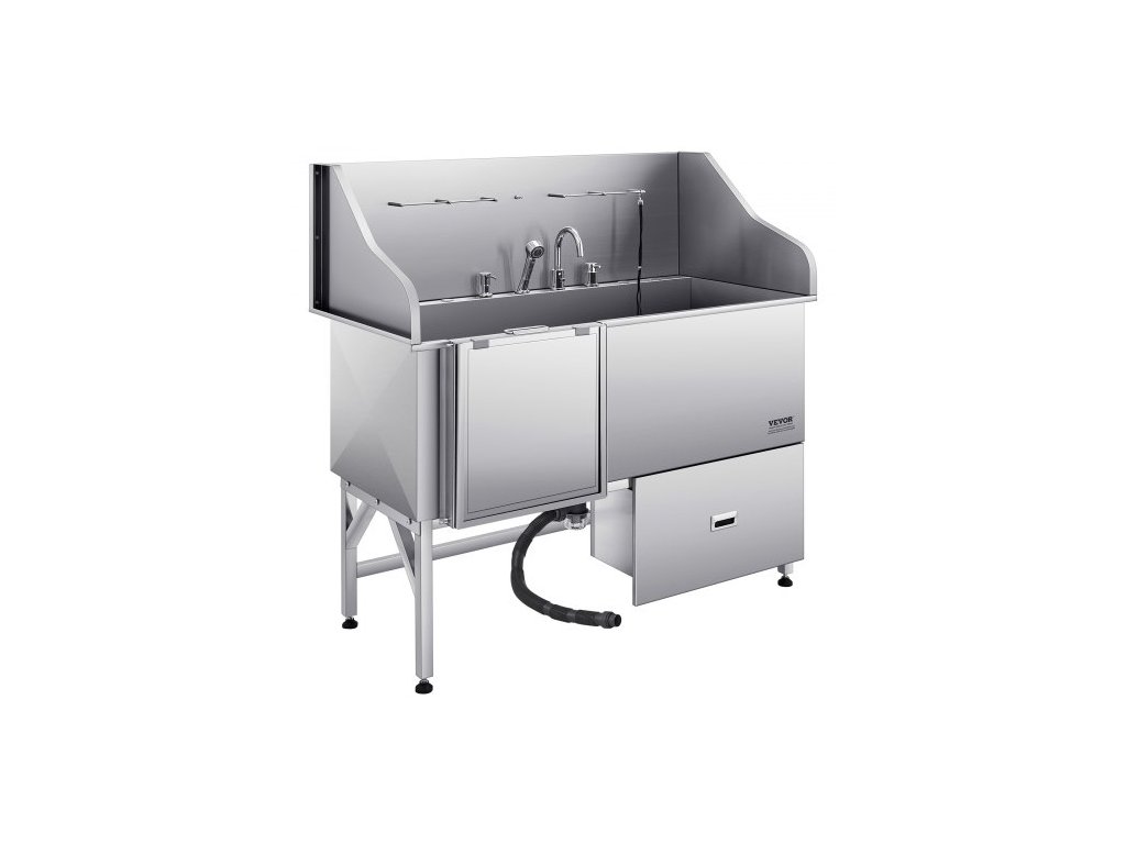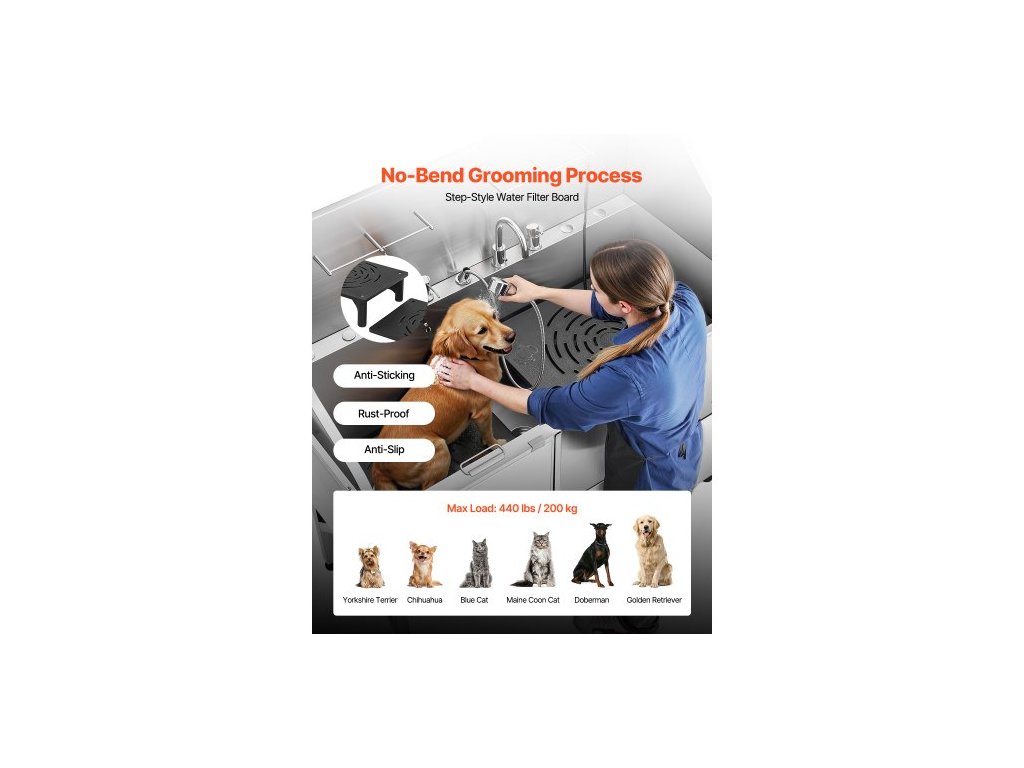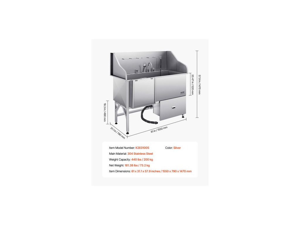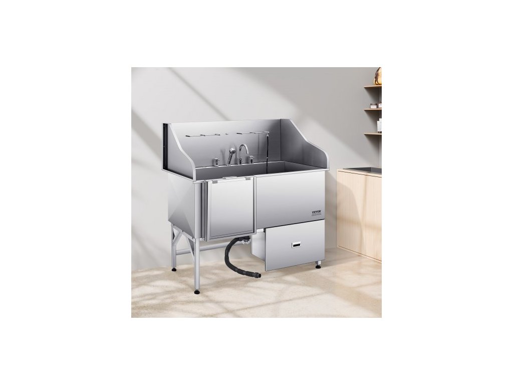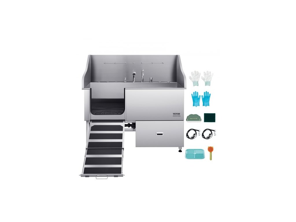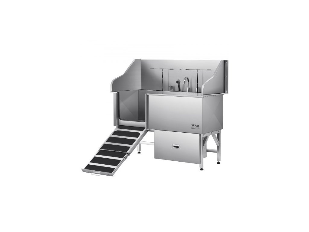 Mycí stanice pro psy 304 z nerezové oceli, vana na stříhání domácích mazlíčků o průměru 154,9 cm s protiskluzovou rampou s nízkým sklonem, úložným prostorem, kohoutkem na teplou a studenou vodu, univerzální vana pro stříhání zvířat, vhodná pro