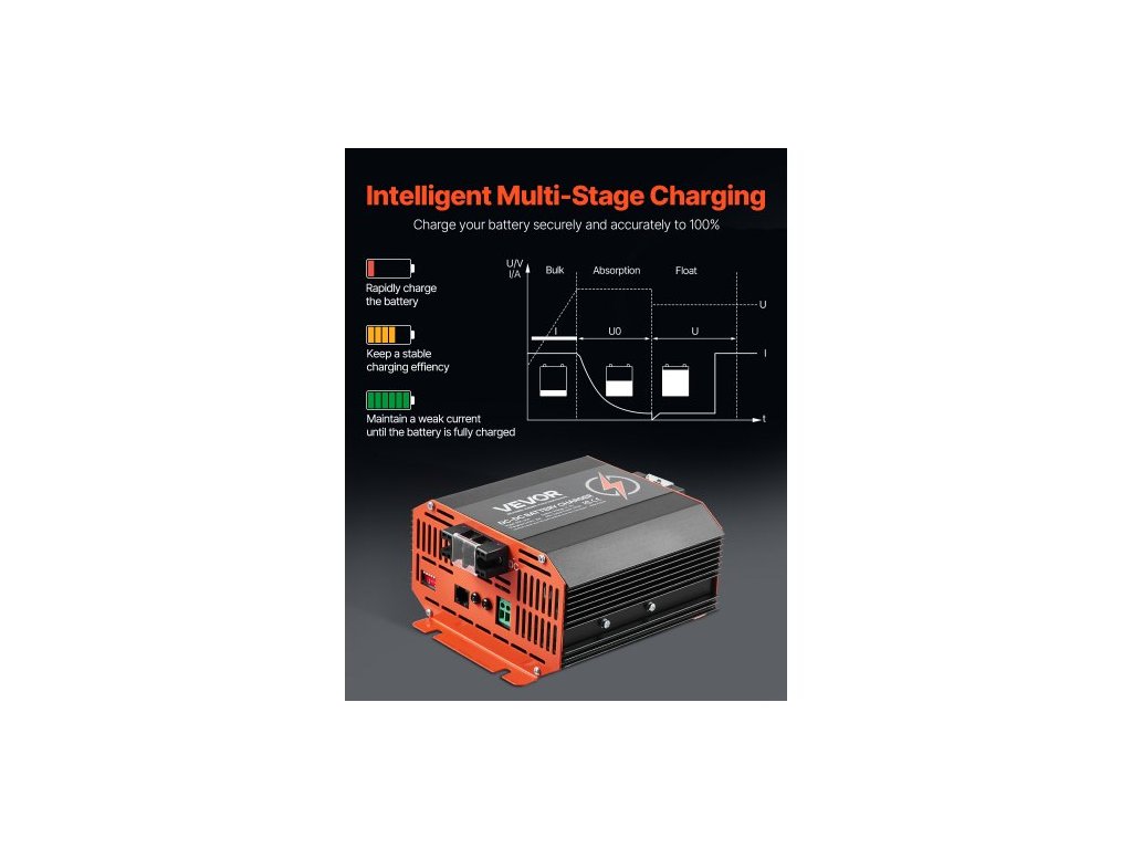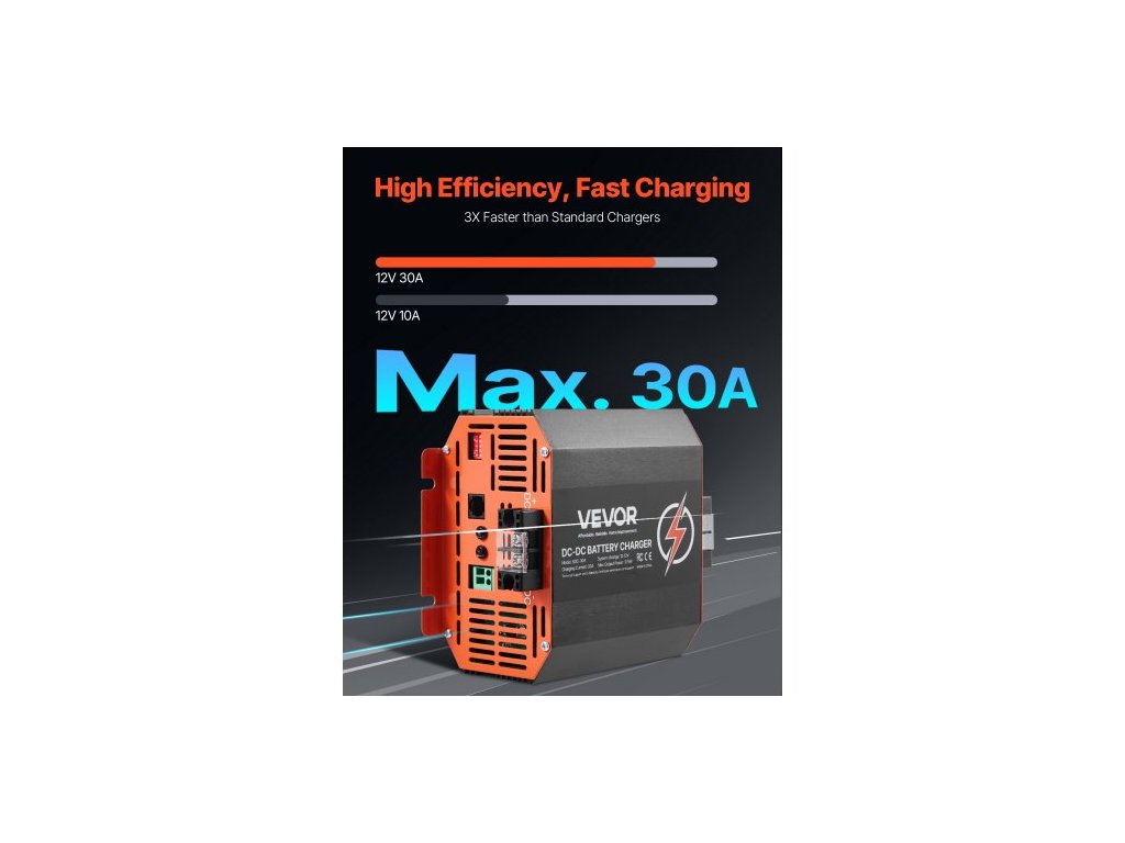 Nabíječka baterií 12V 30A DC-DC, 375W, integrovaná nabíječka baterií pro olověné, lithiové, AGM, gelové a zaplavené baterie, inteligentní vícestupňové nabíjení, pro obytné vozy, užitková vozidla, lodě, jachtyEfektivní nabíjení