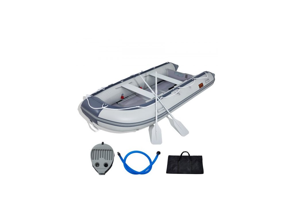 Nafukovací člun , sportovní člun s 6 místy na zádi, s dřevěnou podlahou z mořského dřeva a nastavitelnou hliníkovou lavicí, nafukovací rybářský raft o nosnosti 1500 liber, hliníková vesla, vzduchové čerpadlo a přepravní taškaNafukovací člun pro 6 osob