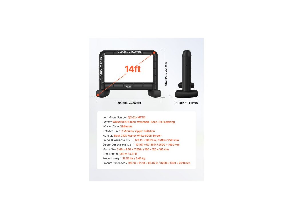 Doba nafouknutí: 2 minuty, Délka kabelu: 1,80 m / 5,91 stop, Plátno: Bílá tkanina 600D, omyvatelné, zapínání na patentky, Rozměry rámu (D x V): 129,13 x 98,82 palců / 3280 x 2510 mm, Číslo modelu položky: QC-ZJ-14FTD, Hmotnost výrobku: 12,02 lbs / 5,45 kg, Materiál: Černý rám 210D, bílý 600D Obrazovka, Doba vyfouknutí: 2 minuty, Vyfouknutí zipu, Rozměry výrobku: 129,13 x 51,18 x 98,82 palce / 3280 x 1300 x 2510 mm, Velikost motoru: 7,48 x 4,92 x 7,28 palce / 190 x 125 x 185 mm, Rozměry obrazovky (D x V): 101,97 x 57,48 palce / 2590 x 1460 mm