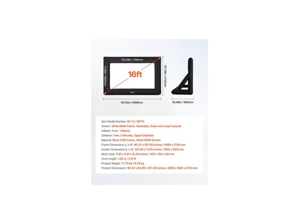 Doba nafouknutí: 1 minuta, Délka kabelu: 1,80 m / 5,91 stop, Plátno: Bílá tkanina 600D, omyvatelné, zapínání na suchý zip, Rozměry rámu (D x V): 161,02 x 107,09 palců / 4090 x 2720 mm, Číslo modelu položky: QC-PJ-16FTD, Hmotnost výrobku: 17,75 liber / 8,05 kg, Materiál: Černý rám 210D, bílý 600D Obrazovka, Doba vyfouknutí: 2 minuty, Vyfouknutí zipu, Rozměry výrobku: 161,02 x 62,99 x 107,09 palců / 4090 x 1600 x 2720 mm, Velikost motoru: 11,81 x 5,91 x 12,20 palců / 300 x 150 x 310 mm, Rozměry obrazovky (D x V): 125,59 x 71,65 palců / 3190 x 1820 mm