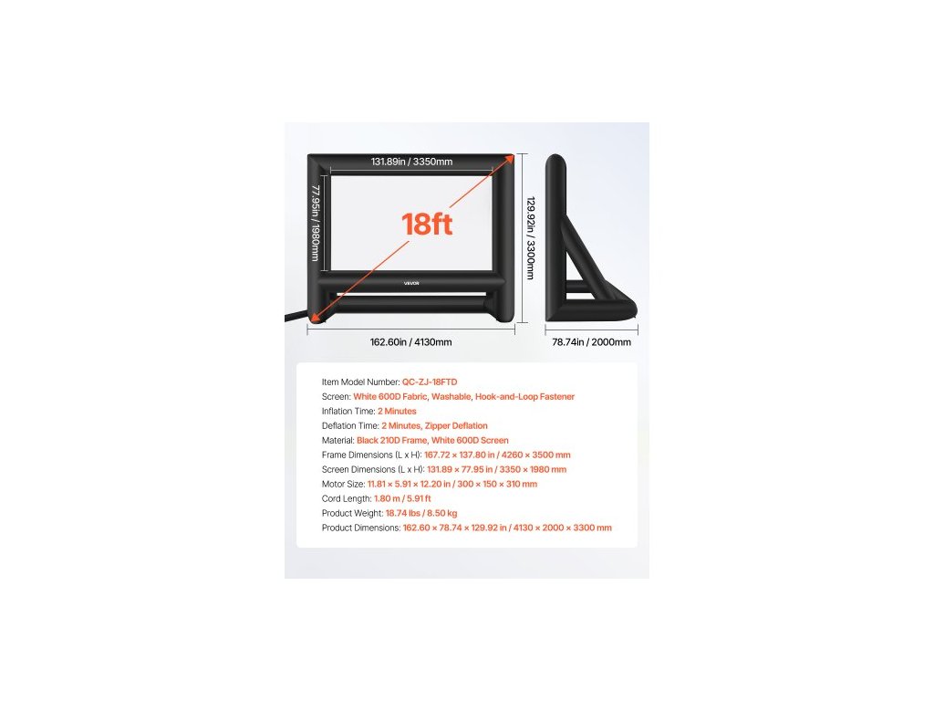Doba nafouknutí: 2 minuty, Délka kabelu: 1,80 m / 5,91 stop, Plátno: Bílá tkanina 600D, omyvatelné, zapínání na suchý zip, Rozměry rámu (D x V): 167,72 x 137,80 palců / 4260 x 3500 mm, Číslo modelu položky: QC-ZJ-18FTD, Hmotnost výrobku: 18,74 liber / 8,50 kg, Materiál: Černý rám 210D, bílý 600D Obrazovka, Doba vyfouknutí: 2 minuty, Vyfouknutí zipu, Rozměry výrobku: 162,60 x 78,74 x 129,92 palce / 4130 x 2000 x 3300 mm, Velikost motoru: 11,81 x 5,91 x 12,20 palce / 300 x 150 x 310 mm, Rozměry obrazovky (D x V): 131,89 x 77,95 palce / 3350 x 1980 mm