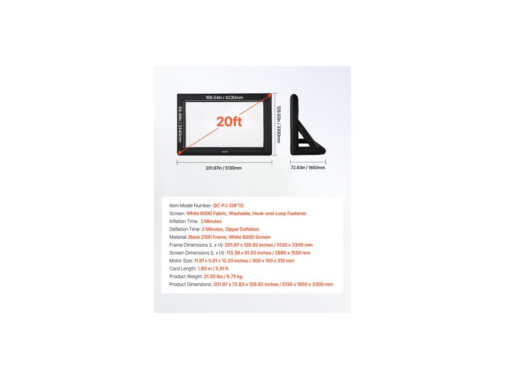 Doba nafouknutí: 2 minuty, Délka kabelu: 1,80 m / 5,91 stop, Plátno: Bílá tkanina 600D, omyvatelné, zapínání na suchý zip, Rozměry rámu (D x V): 201,97 x 129,92 palců / 5130 x 3300 mm, Číslo modelu položky: QC-PJ-20FTD, Hmotnost výrobku: 21,50 liber / 9,75 kg, Materiál: Černý rám 210D, bílý 600D Obrazovka, Doba vyfouknutí: 2 minuty, Vyfouknutí zipu, Rozměry produktu: 201,97 x 72,83 x 129,92 palců / 5130 x 1850 x 3300 mm, Velikost motoru: 11,81 x 5,91 x 12,20 palců / 300 x 150 x 310 mm, Rozměry obrazovky (D x V): 166,54 x 94,49 palců / 4230 x 2400 mm