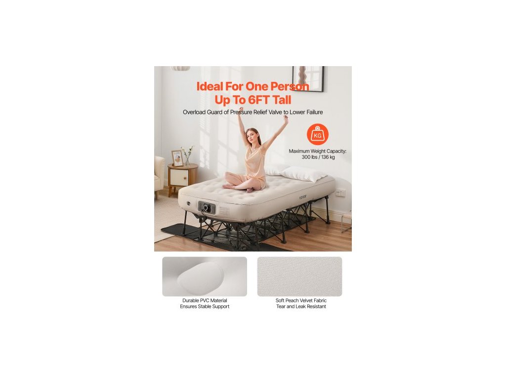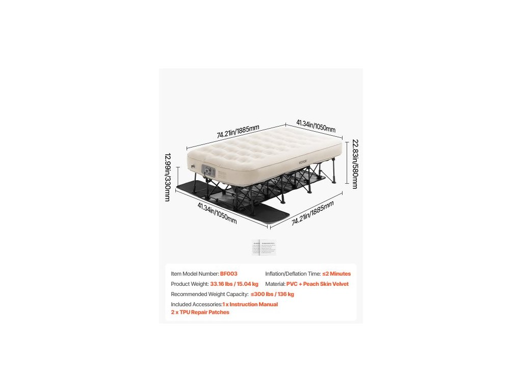 Rozměry matrace: 1885 x 1050 x 255 mm,Doporučená nosnost: ≤136 kg,Číslo modelu položky: BF003,Hmotnost výrobku: 15,04 kg,Doba nafouknutí/vyfouknutí: 2 minuty,Materiál: PVC + broskvový samet,Rozměry rámu postele: 38,98 x 60,63 x 12,99 palce / 990 x 1540 x 330 mm, Rozměry produktu: 74,21 x 41,34 x 22,83 palce / 1885 x 1050 x 580 mm