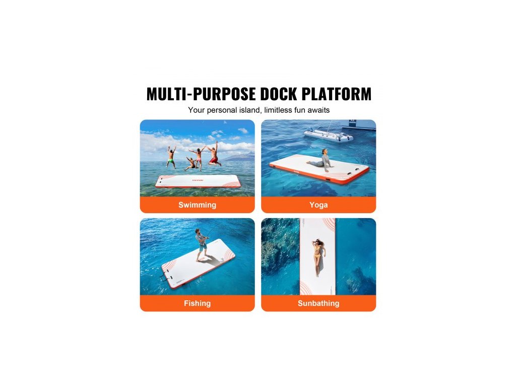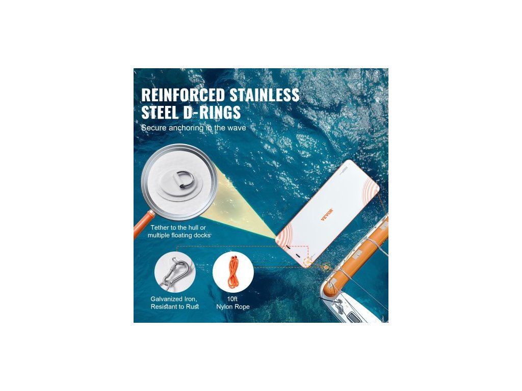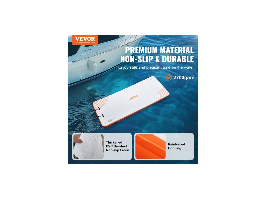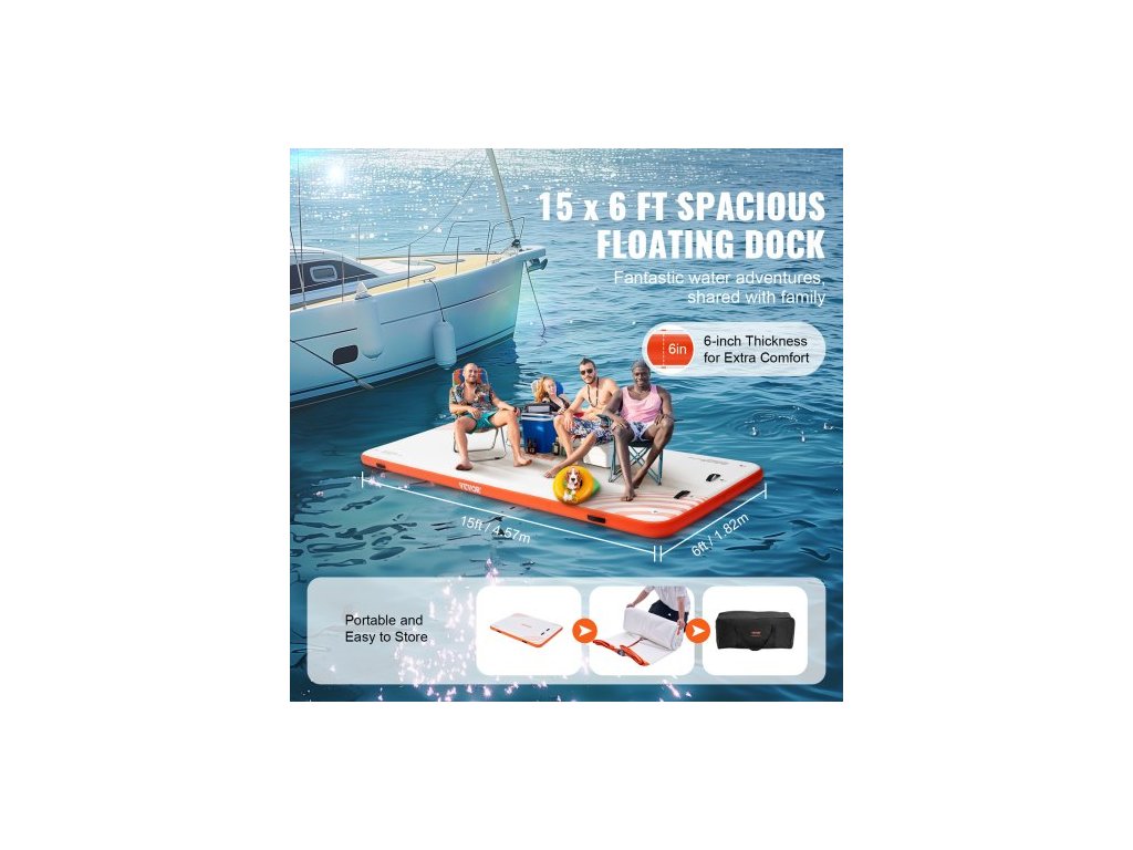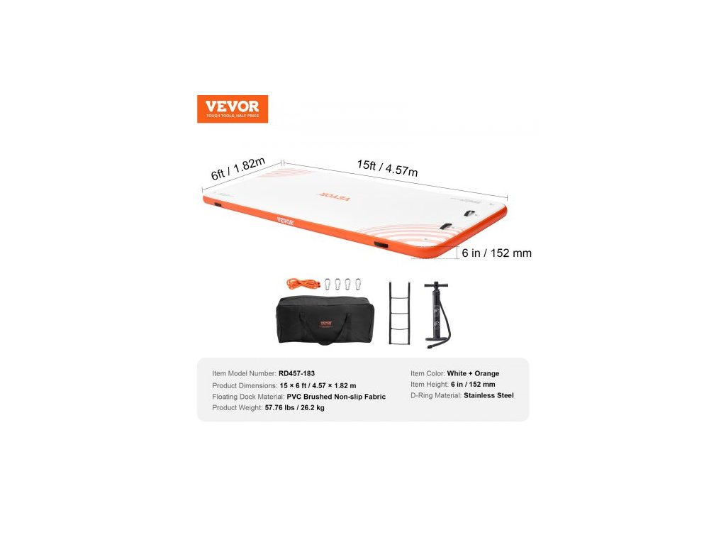 Materiál plovoucího doku: PVC kartáčovaná protiskluzová tkanina,Barva výrobku: Bílá + oranžová,Výška výrobku: 6 palců / 152 mm,Číslo modelu výrobku: RD457-183,Materiál D-kroužku: Nerezová ocel,Hmotnost výrobku: 57,76 liber / 26,2 kg,Rozměry výrobku: 15 x 6 stop / 4,57 x 1,82 m
