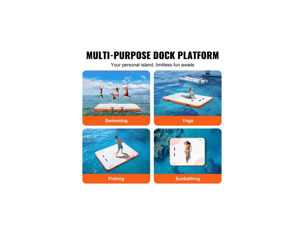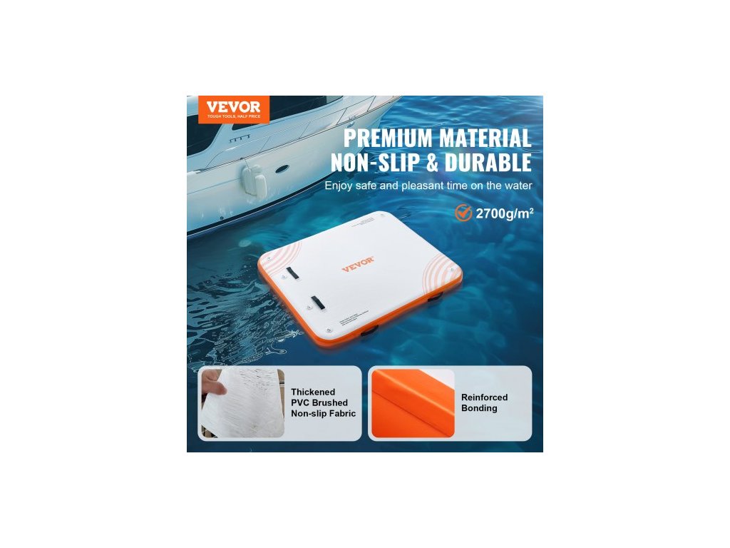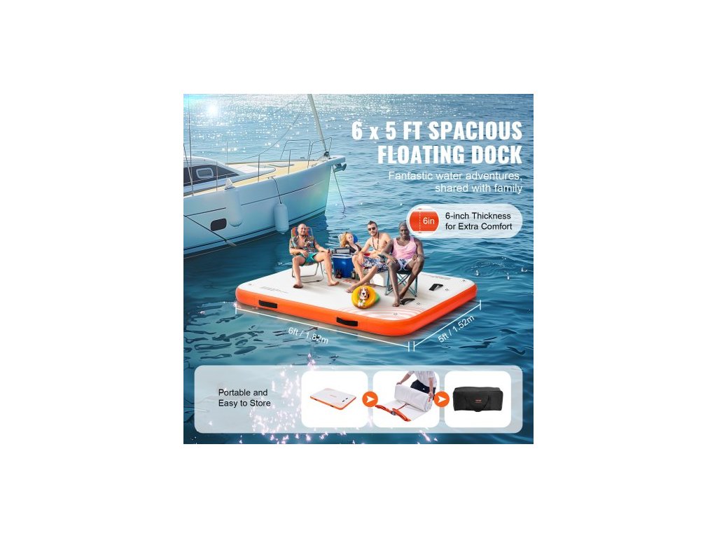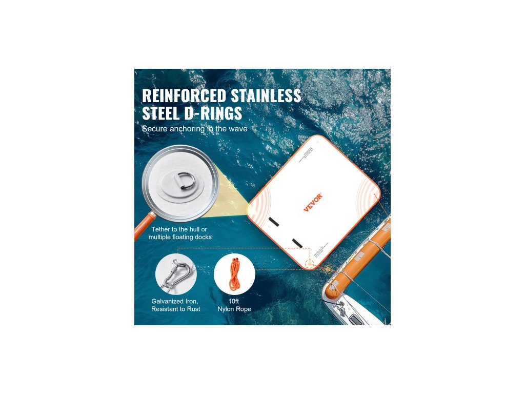 Materiál plovoucího doku: PVC kartáčovaná protiskluzová tkanina,Barva výrobku: Bílá + oranžová,Výška výrobku: 6 palců / 152 mm,Číslo modelu výrobku: RD183-152,Materiál D-kroužku: Nerezová ocel,Hmotnost výrobku: 24,25 liber / 11 kg,Rozměry výrobku: 6 x 5 stop / 1,82 x 1,52 m