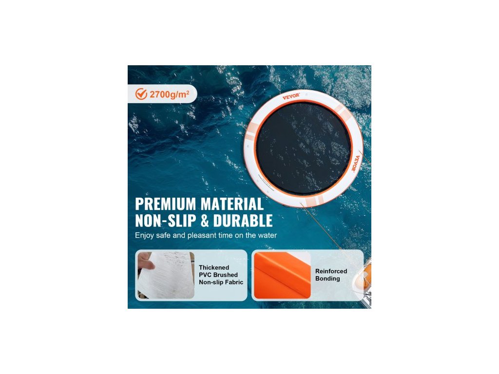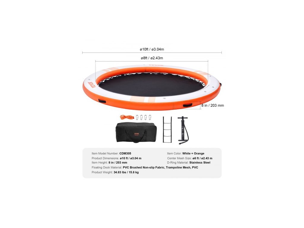Barva výrobku: Bílá + oranžová,Rozměry výrobku: ø10 stop / ø3,04 m,Materiál plováku: PVC kartáčovaná protiskluzová tkanina, trampolínová síťovina, PVC,Výška výrobku: 8 palců / 203 mm,Číslo modelu výrobku: CDM305,Materiál D-kroužku: Nerezová ocel,Hmotnost výrobku: 34,83 lbs / 15,8 kg,Rozměr středové sítě: ø8 stop / ø2,43 m