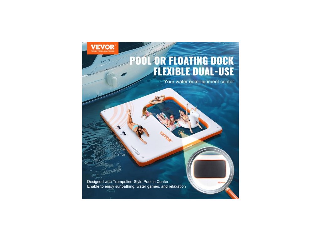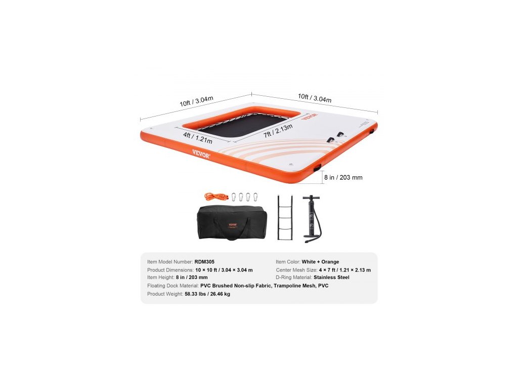 Barva výrobku: Bílá + oranžová,Rozměry výrobku: 10 x 10 stop / 3,04 x 3,04 m,Materiál plováku: PVC kartáčovaná protiskluzová tkanina, trampolínová síťovina, PVC,Výška výrobku: 8 palců / 203 mm,Číslo modelu výrobku: RDM305,Materiál D-kroužku: Nerezová ocel,Hmotnost výrobku: 58,33 liber / 26,46 kg,Rozměry středové sítě: 4 x 7 stop / 1,21 x 2,13 m