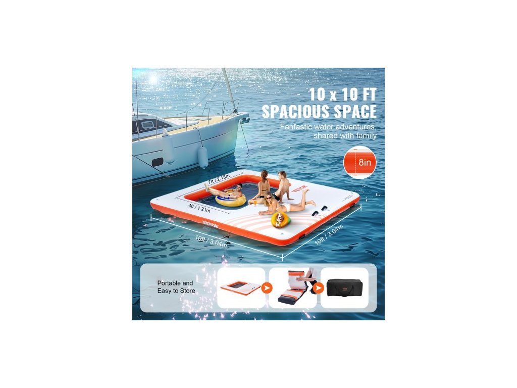 Nafukovací plovoucí dok , nafukovací dokovací plošina 10x10 stop s trampolínovým síťovým bazénem 4*7 stop, protiskluzová plovoucí vodní podložka s přenosnou taškou a odnímatelným žebříkem pro relaxaci u bazénu a plážeDvojčinné ruční čerpadlo