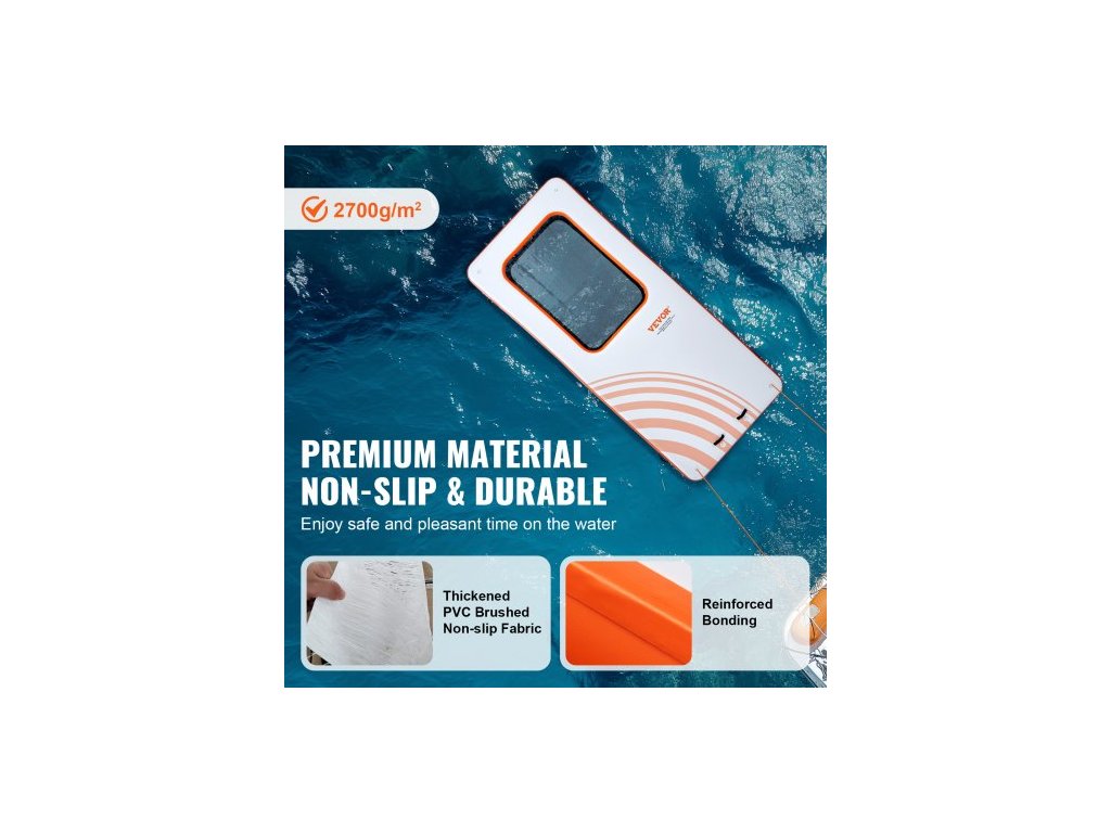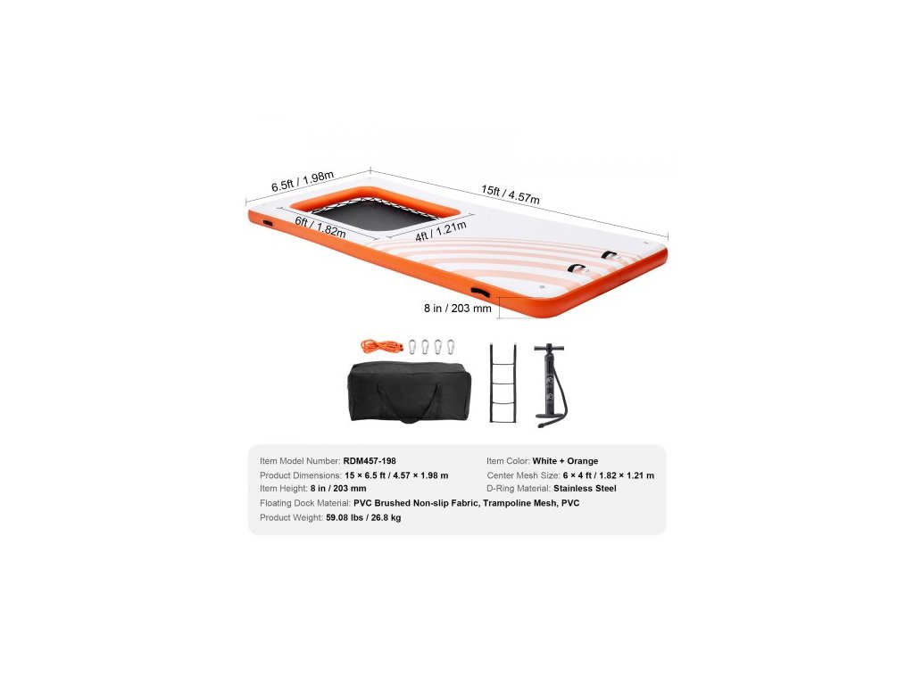Barva výrobku: Bílá + oranžová,Rozměry výrobku: 15 x 6,5 stop / 4,57 x 1,98 m,Materiál plováku: PVC kartáčovaná protiskluzová tkanina, trampolínová síťovina, PVC,Výška výrobku: 8 palců / 203 mm,Číslo modelu výrobku: RDM457-198,Materiál D-kroužku: Nerezová ocel,Hmotnost výrobku: 59,08 liber / 26,8 kg,Rozměry středové sítě: 4 x 6 stop / 1,21 x 1,82 m