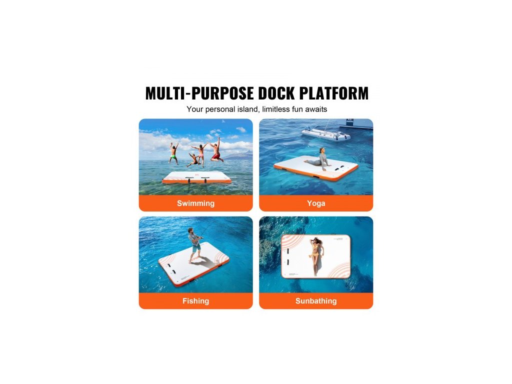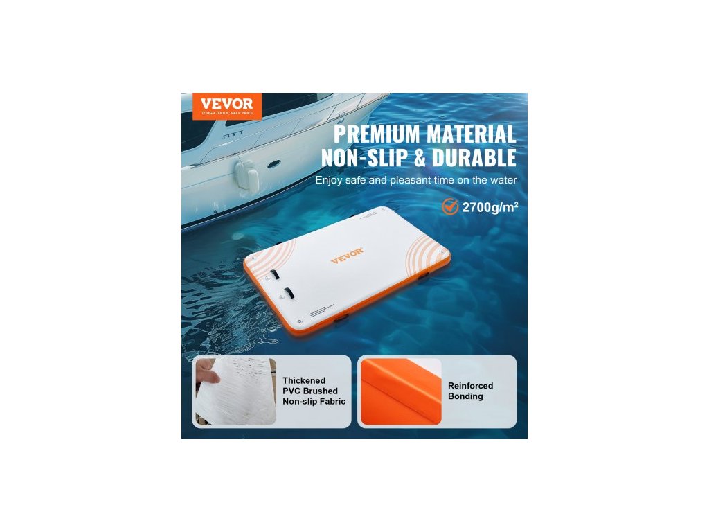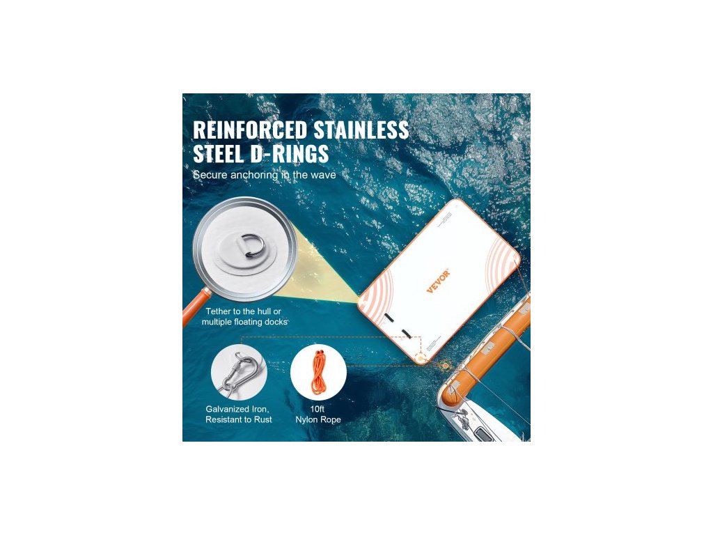 Materiál plovoucího doku: PVC kartáčovaná protiskluzová tkanina,Barva výrobku: Bílá + oranžová,Výška výrobku: 6 palců / 152 mm,Číslo modelu výrobku: RD244-152,Materiál D-kroužku: Nerezová ocel,Hmotnost výrobku: 32,63 liber / 14,8 kg,Rozměry výrobku: 8 x 5 stop / 2,43 x 1,52 m