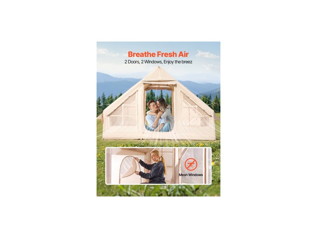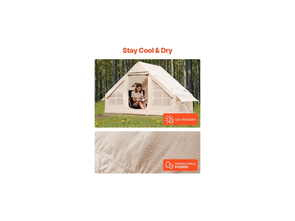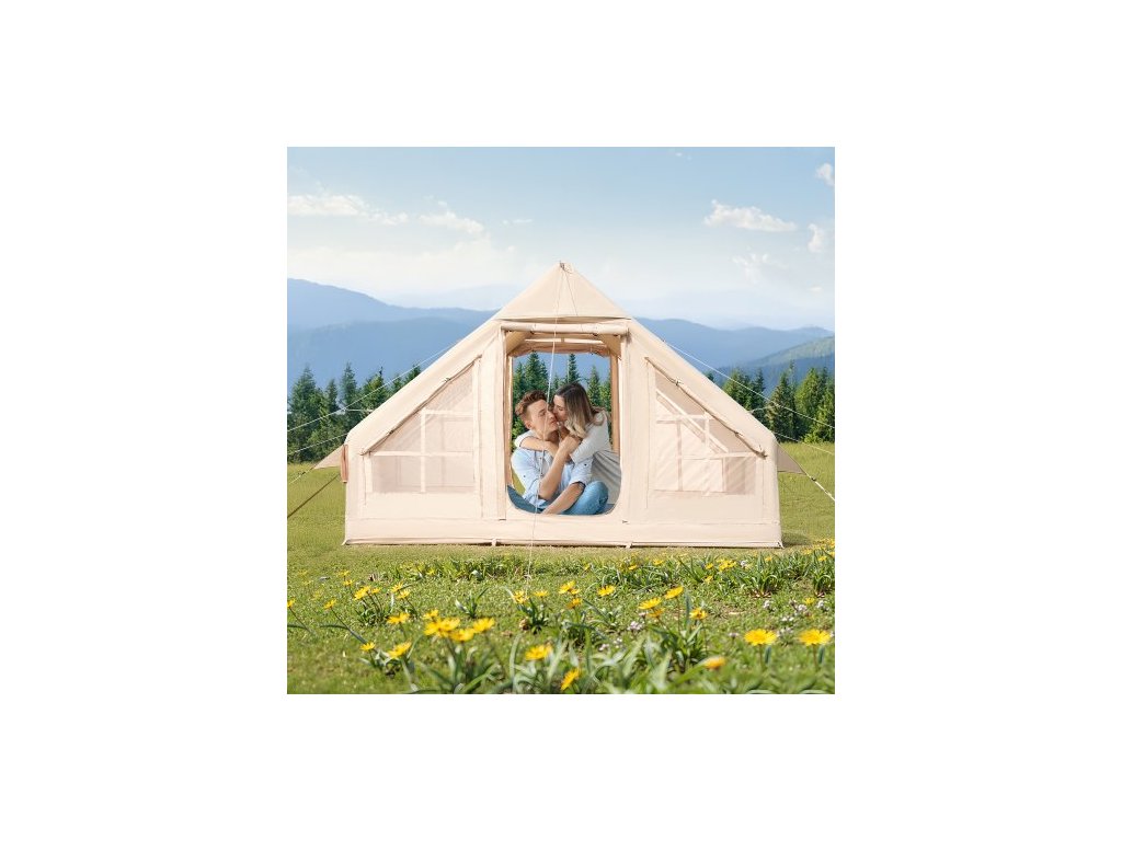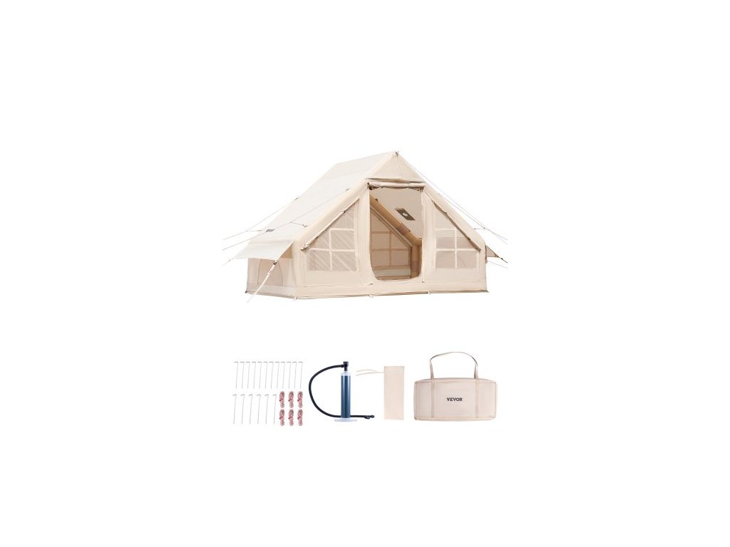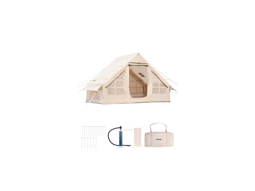 Nafukovací stany pro kempování, snadno sestavitelný nafukovací stan pro 3-5 osob s ruční pumpou, 300D Oxford 4 sezónní glampingový stan s vařičem, 2 dveře a 2 síťovaná okna, úložný vak součástí balení pro snadné přenášeníHáček na zavěšení lucerny