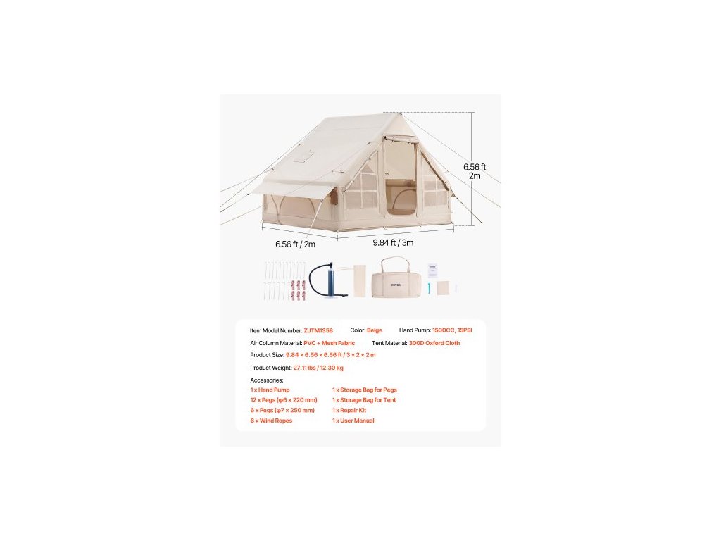 Ruční pumpa: 1500CC, 15PSI,Barva: Béžová,Číslo modelu položky: ZJTM1358,Hmotnost výrobku: 27,11 lbs / 12,30 kg,Materiál vzduchového sloupce: PVC + síťovina,Materiál stanu: 300D Oxfordská tkanina,Rozměry výrobku: 9,84 x 6,56 x 6,56 stop / 3 x 2 x 2 m