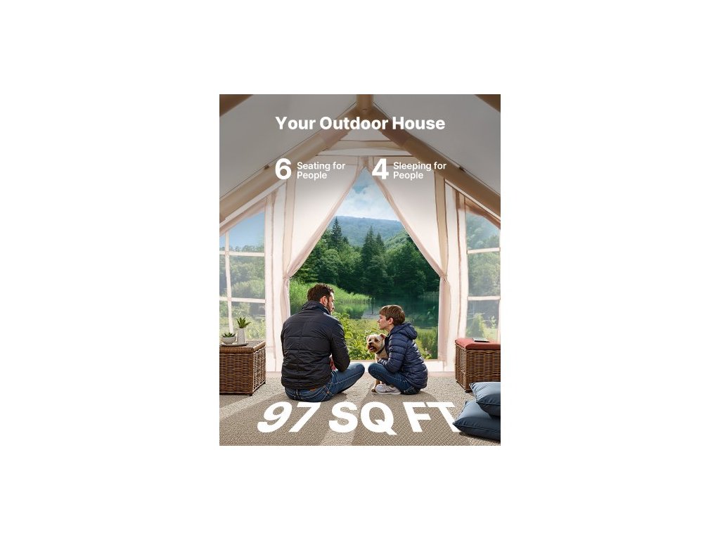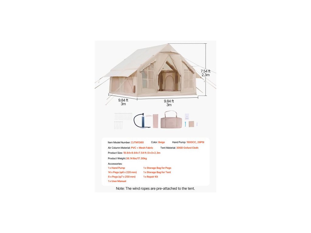 Ruční pumpa: 1500CC, 15PSI,Barva: Béžová,Číslo modelu položky: ZJTM1360,Hmotnost výrobku: 38,14 lbs / 17,30 kg,Materiál vzduchového sloupce: PVC + síťovina,Materiál stanu: 300D Oxfordská tkanina,Rozměry výrobku: 9,84 x 9,84 x 7,54 stop / 3 x 3 x 2,3 m