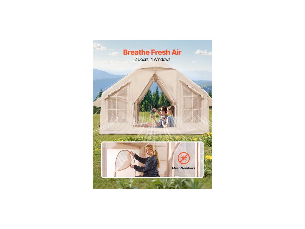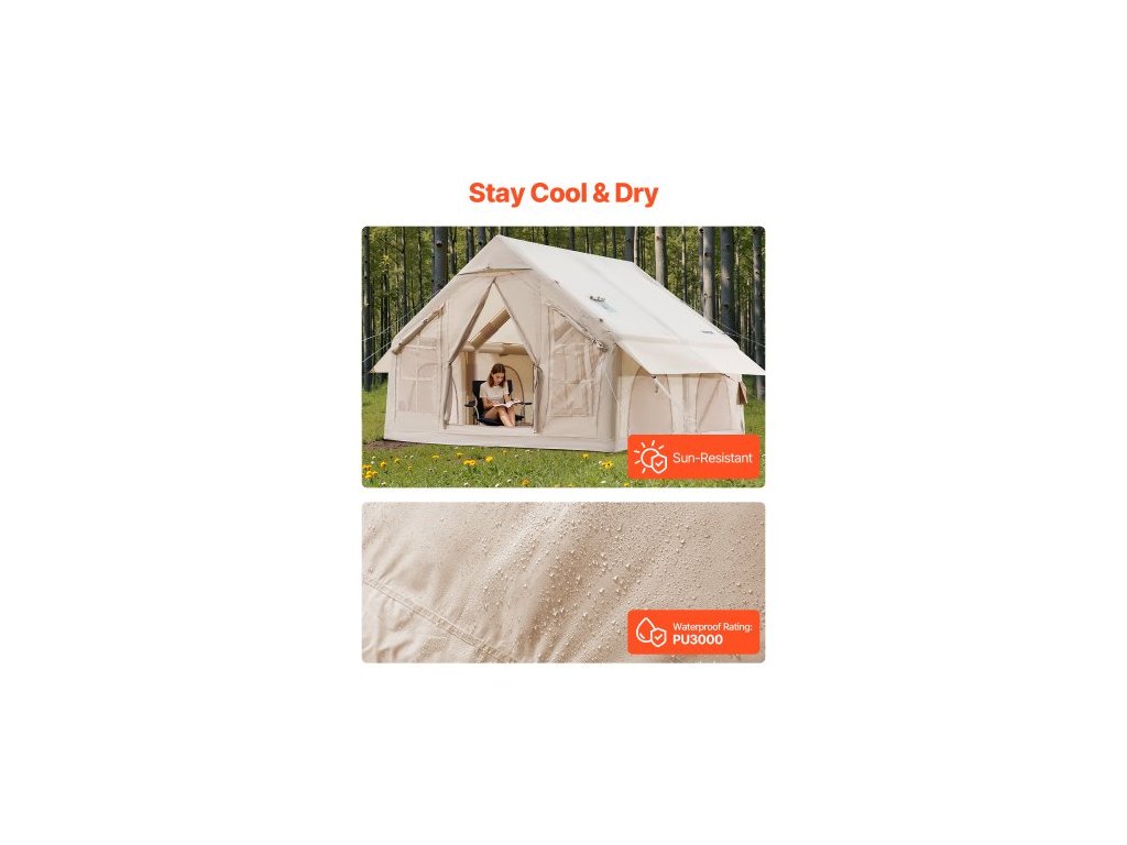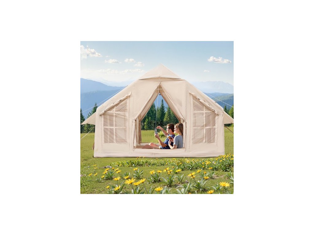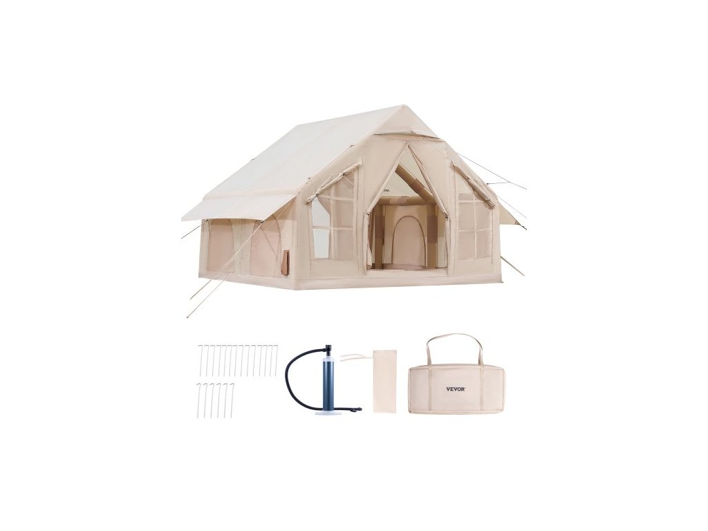 Nafukovací stany pro kempování, snadno sestavitelný nafukovací stan pro 4-6 osob s ruční pumpou, 300D Oxford 4 sezónní glampingový stan s vařičem, 2 dveře a 4 síťovaná okna, úložný vak součástí balení pro snadné přenášeníHáček na zavěšení lucerny