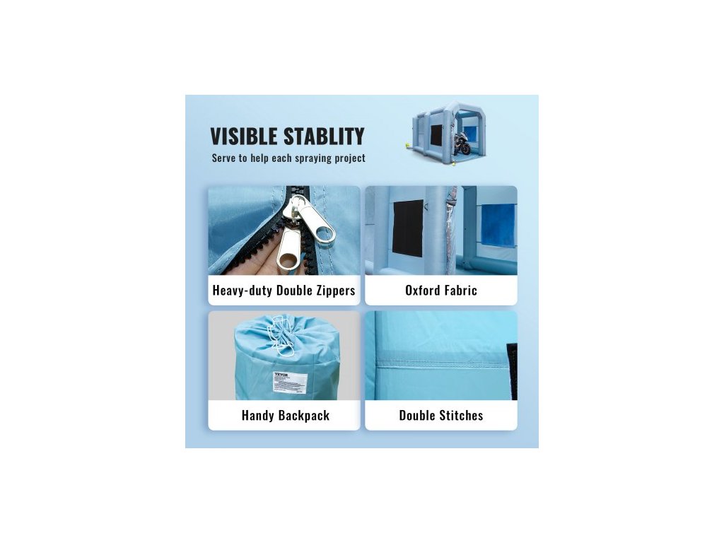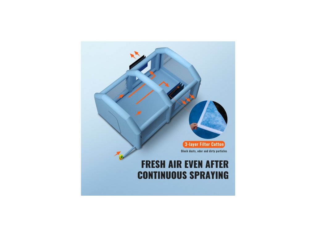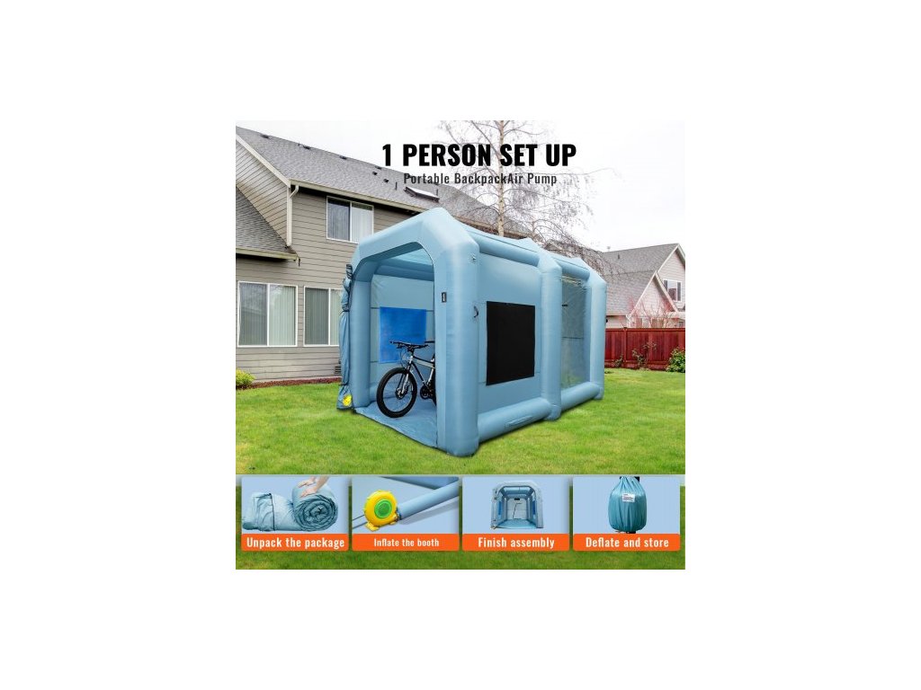 Nafukovací stan na lakování automobilů 396 cm x 305 cm x 274 cm, filtrační systém, ventilátor 950 W, zip odolný proti výbuchu, dvojité prošívání, 210D oxfordská tkanina, třívrstvá vyměnitelná bavlna, účinné ventilátory, praktický batoh, hladina hluku: ≤75 dB, počet filtračních okének: 6, barva: modrá, číslo modelu: YJSSX04, rozměry filtrační bavlny: 6,56 x 3,28 stop / 2 x 1 m, materiál: 210D oxfordská tkanina, vnější rozměry: 13,12 x 9,67 x 9 stop / 4 x 2,95 x 2,75 m, čistá hmotnost: 47,62 lbs / 21,6 kg, vnitřní pracovní prostor: 13,12 x 7,22 x 7,7 stop / 4 x 2,2 x 2,35 mDoplňkové parametry
