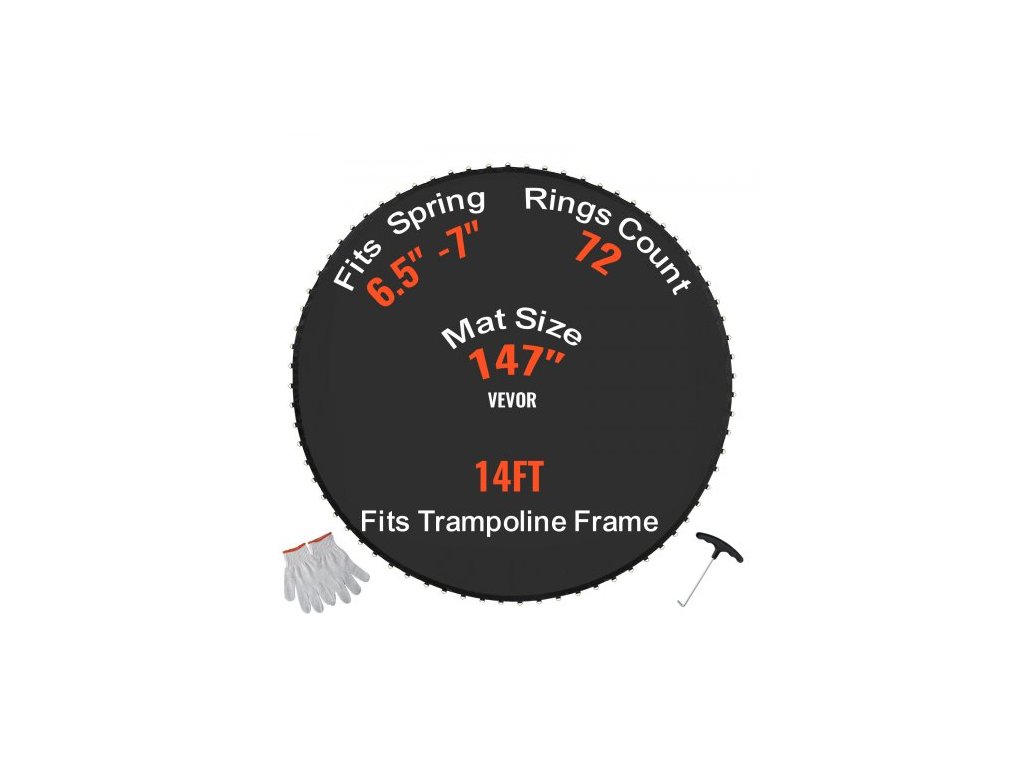 Pasuje na délku pružiny: 6,5-7 palců / 16,5-17,8 cm, průměr skákací podložky: 147 palců / 373 cm, číslo modelu položky: SDKC2024XT0626QGQ, hmotnost výrobku: 10,5 lbs / 4,8 kg, pasuje na rám trampolíny, vnější průměr: 14 stop / 426 cm, materiál skákací sítě: PP