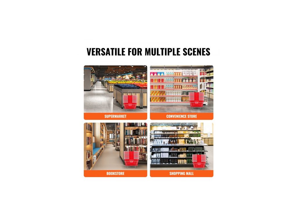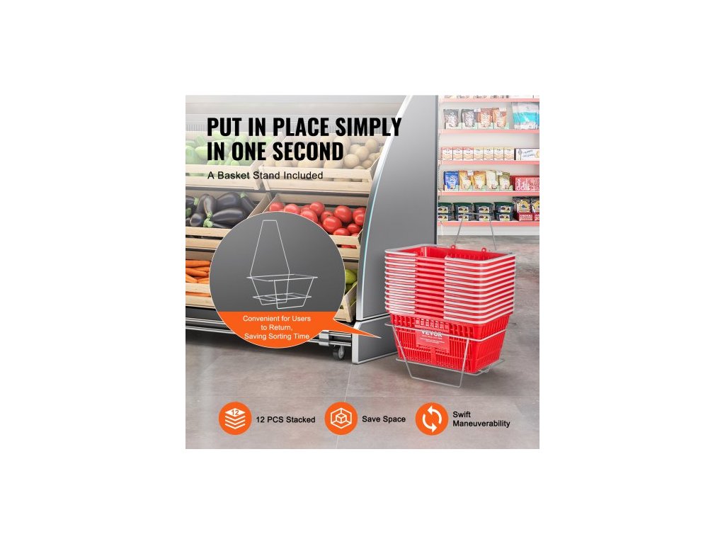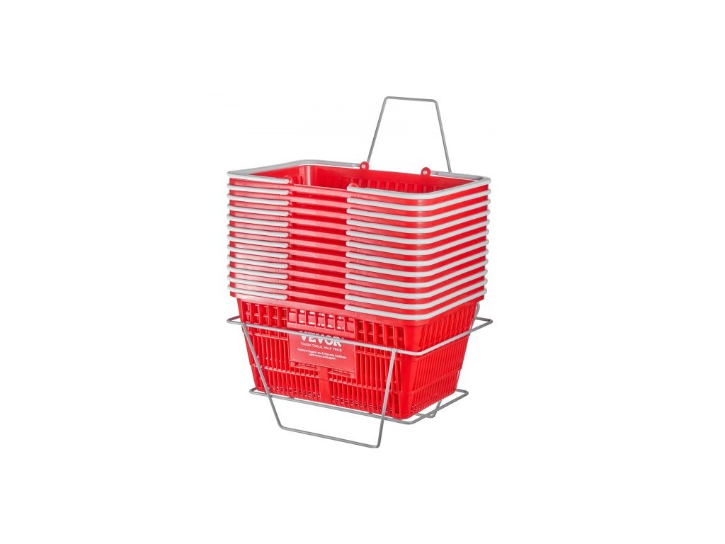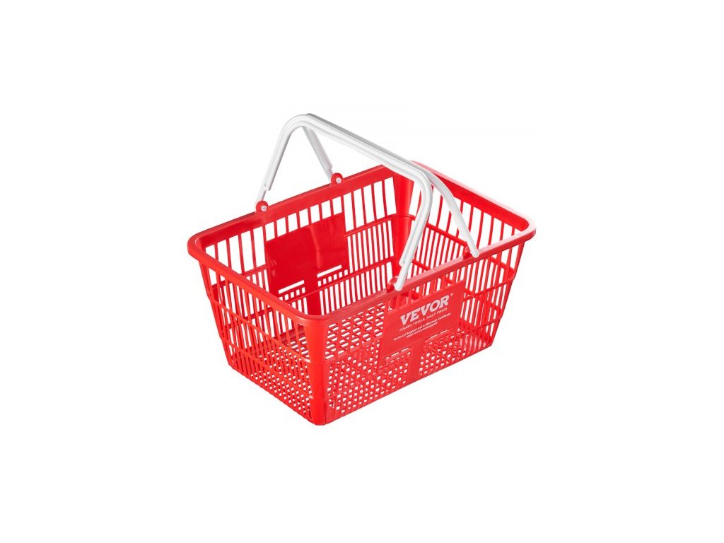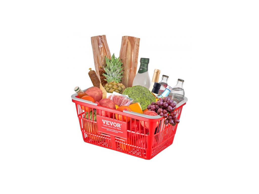 Nákupní košík , sada 12 kusů, odolný plastový košík na potraviny o objemu 21 l s rukojetí a stojanem, přenosný košík na nákup potravin o rozměrech 16,5 x 11,8 x 8,27 palce, určený pro maloobchodní prodejny a supermarkety, červenýVelkorysá kapacita