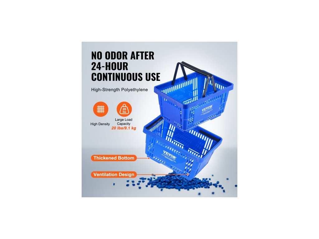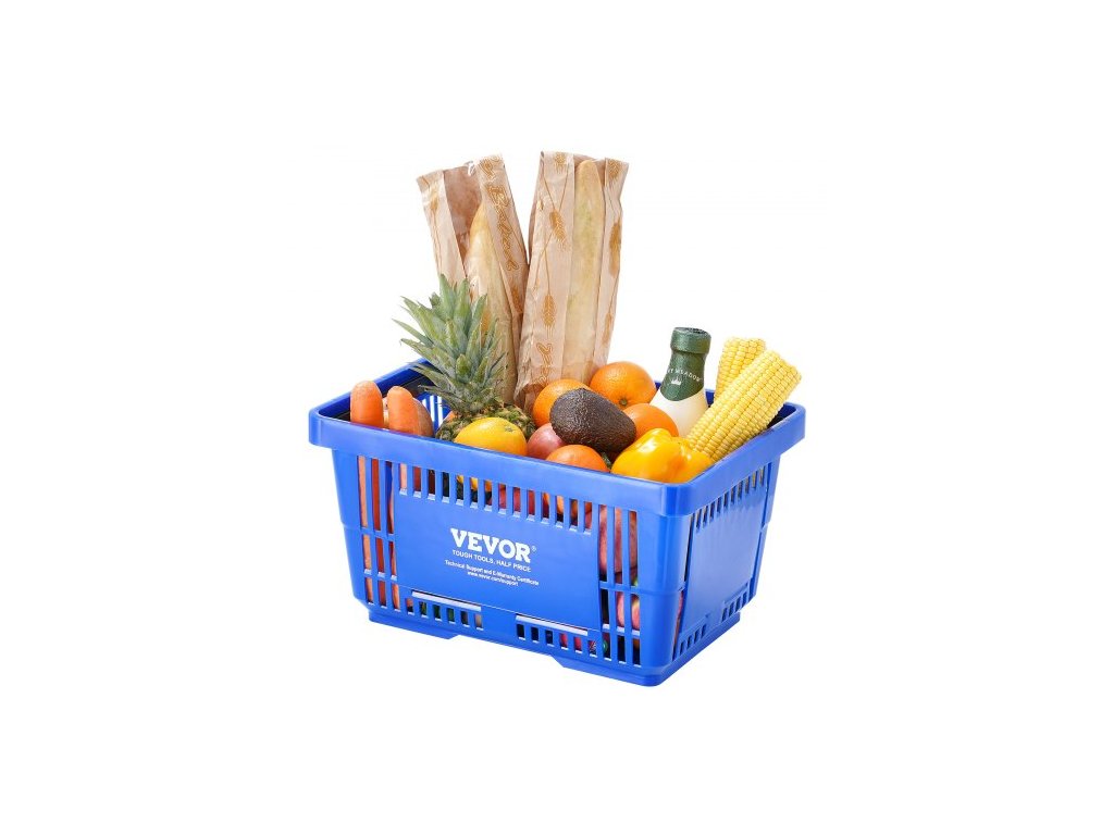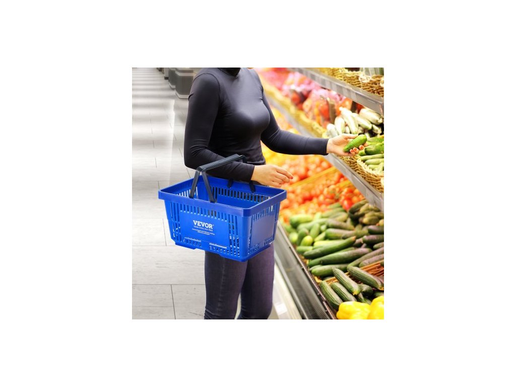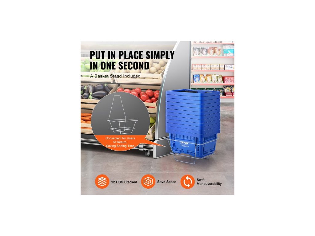 Nákupní košík , sada 12 kusů, odolný plastový košík na potraviny o objemu 24 l s rukojetí a stojanem, přenosný košík na nákup potravin o rozměrech 16,73 x 11,61 x 8,86 palce, vhodný pro maloobchodní prodejny, supermarkety, modrýVelkorysá kapacita