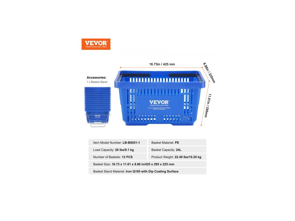 Objem koše: 24 l, Nosnost: 9,1 kg, Materiál koše: PE, Počet košů: 12 ks, Číslo modelu položky: LB-B0051-1, Hmotnost výrobku: 10,20 kg, Velikost koše: 425 x 295 x 225 mm, Materiál stojanu na košík: Železo Q195 s povrchovou úpravou ponorem